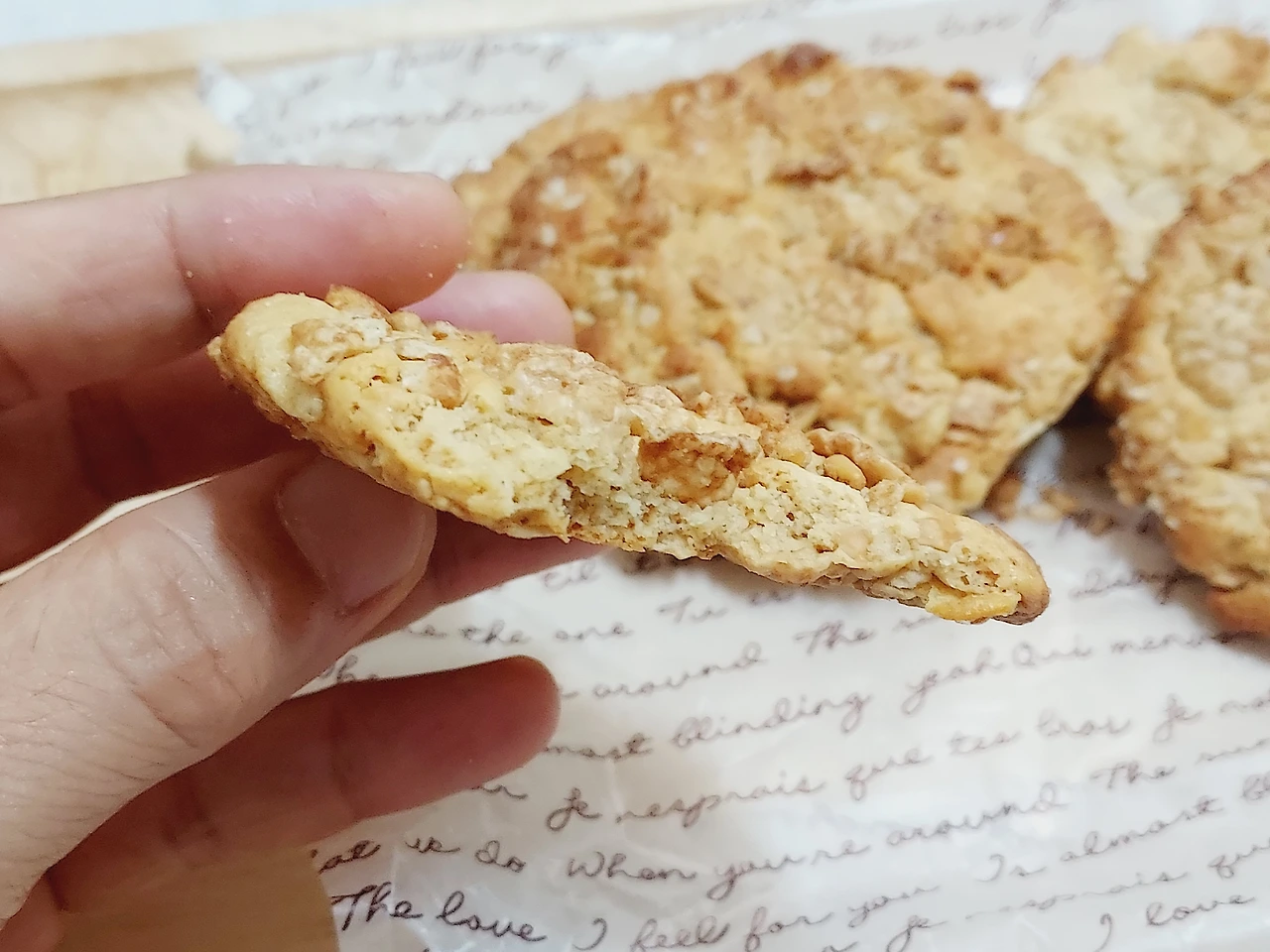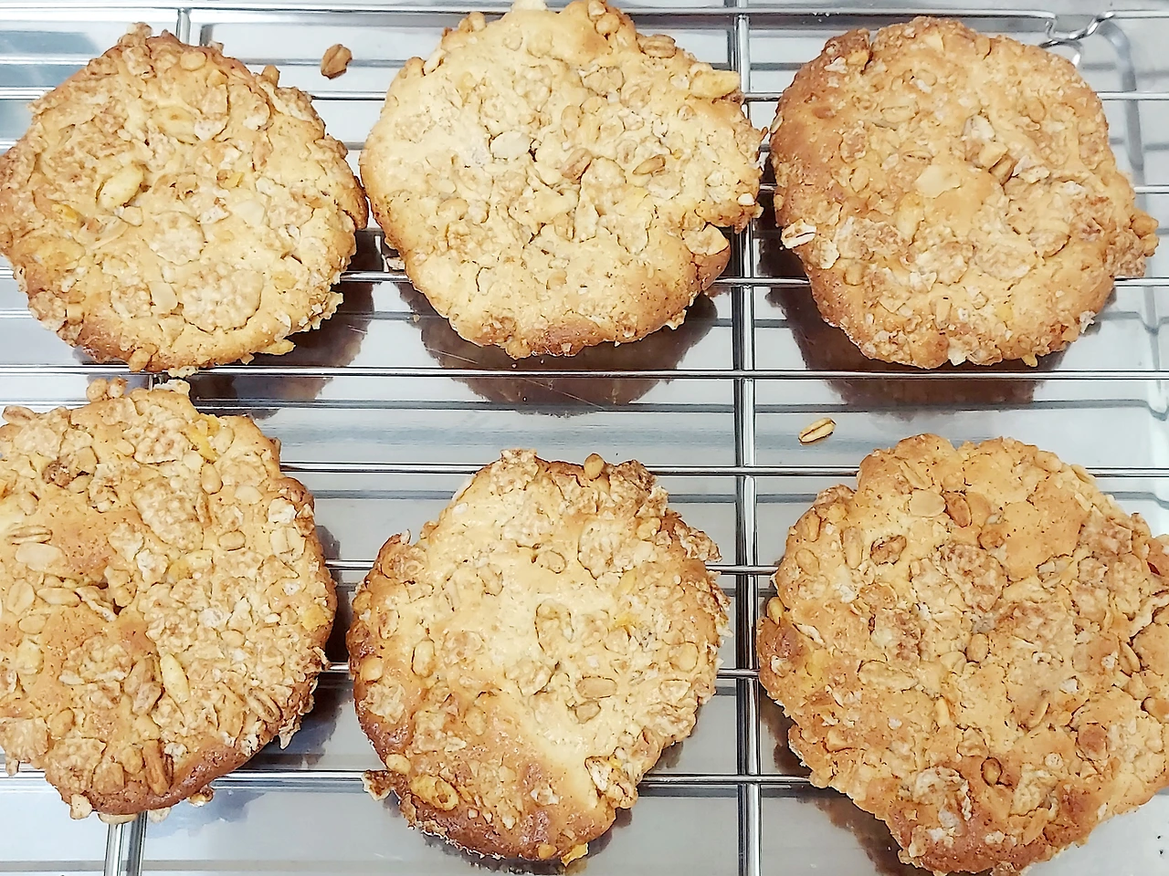 갓 구워 식힌 땅콩쿠키. 땅콩잼의 고소함과 콘플레이크의 바삭함이 어우러져 맛있다. 시간이 좀 지나면 꾸덕해지는데, 그것 나름대로 매력 있어 한번 구우면 부스러기까지 먹어 치우곤 한다.