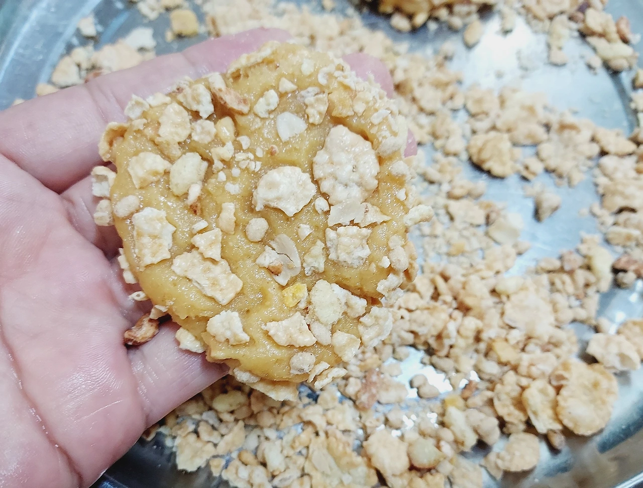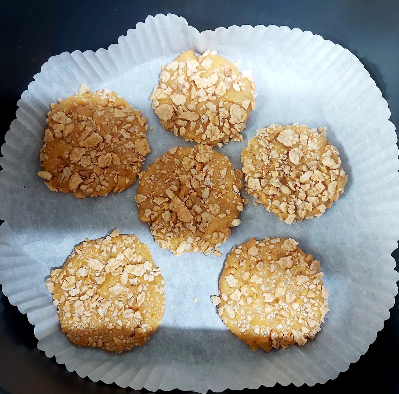 납작이가 된 반죽을 그냥 구워도 되지만, 잘 안 먹는 콘플레이크가 있어 써보기로 했다. 콘플레이크를 부서 준 다음 반죽을 올려 앞뒤로 묻혀주기.