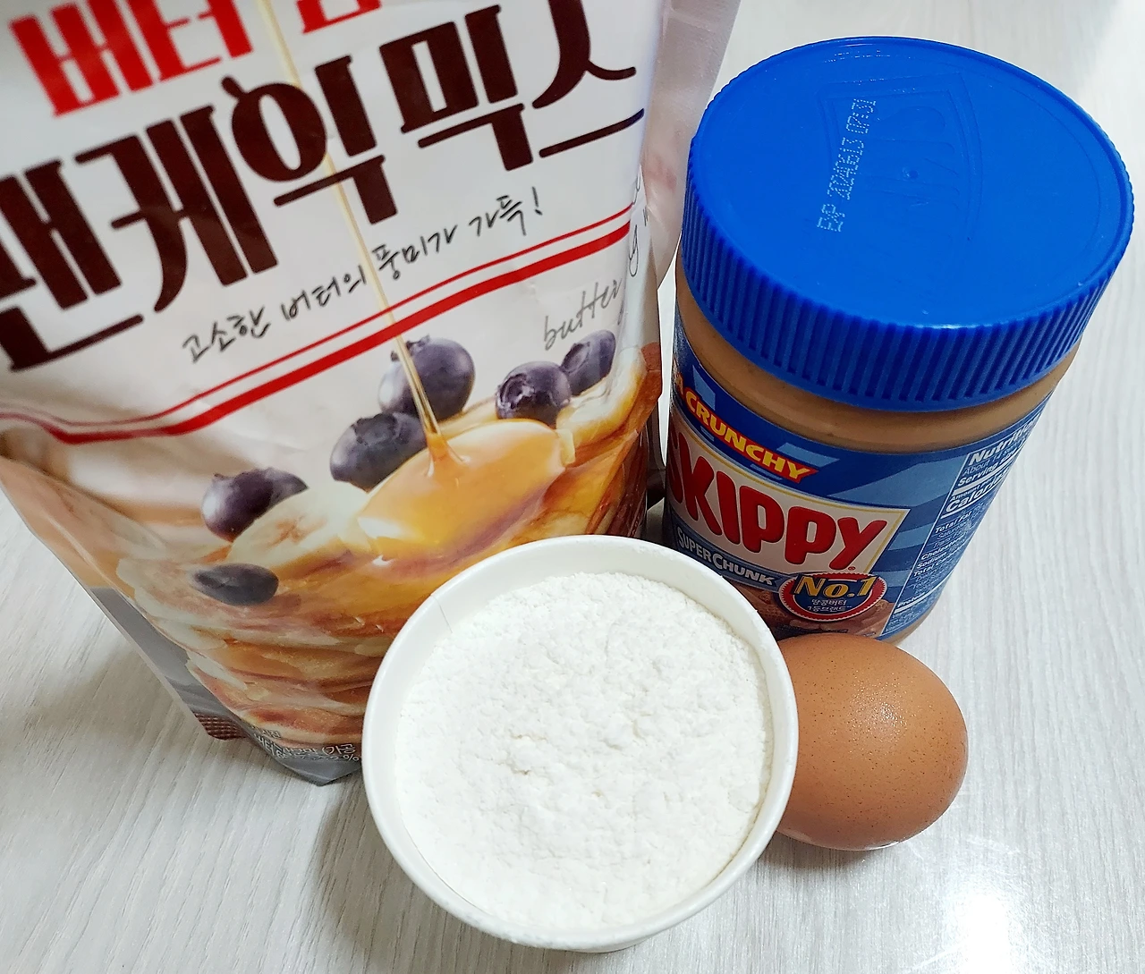 땅콩잼쿠키의 주재료는 세 가지만 있으면 된다. 팬케익믹스, 달걀, 그리고 땅콩잼.