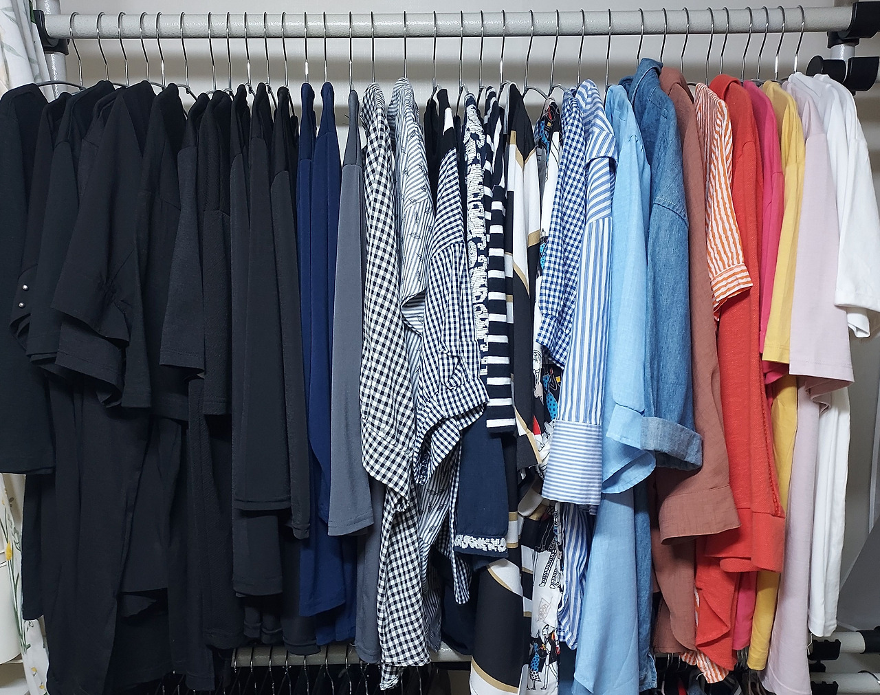 또 다른 예가 옷장이다. 난 옷을 이렇게 컬러별로 정리하기 시작하면서 검정옷이 지나치게 많고 또 자주 입는다는 걸 알았다. 지금은 밝은색 옷도 골고루 입으려고 해서 저 정도지, 정리초기에는 검정색 상의가 헹거의 절반 이상을 차지해 놀랐었다. "내가 검정색을 너무 자주 입는구나. 저게 연탄광도 아니고 뭐래"하면서.