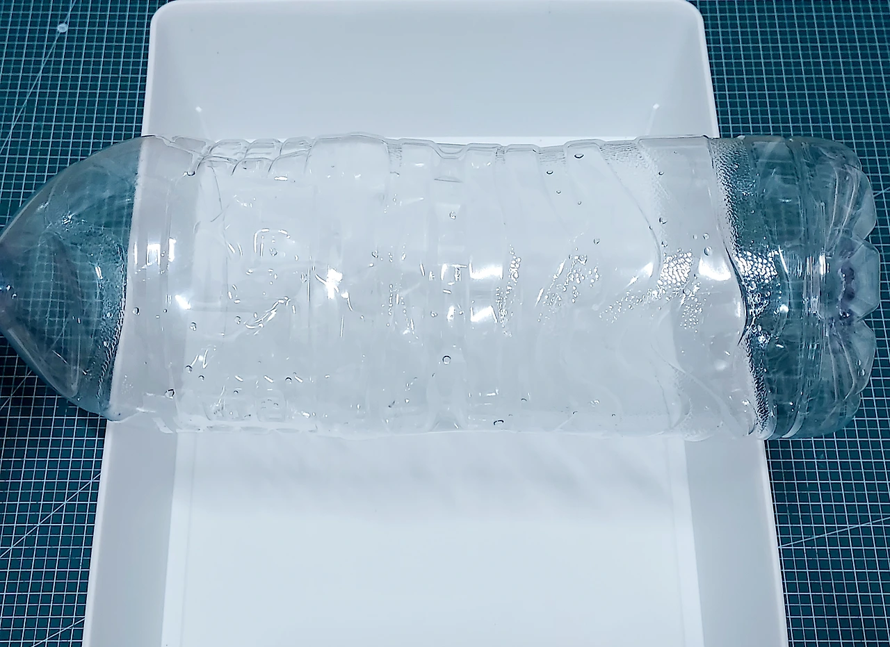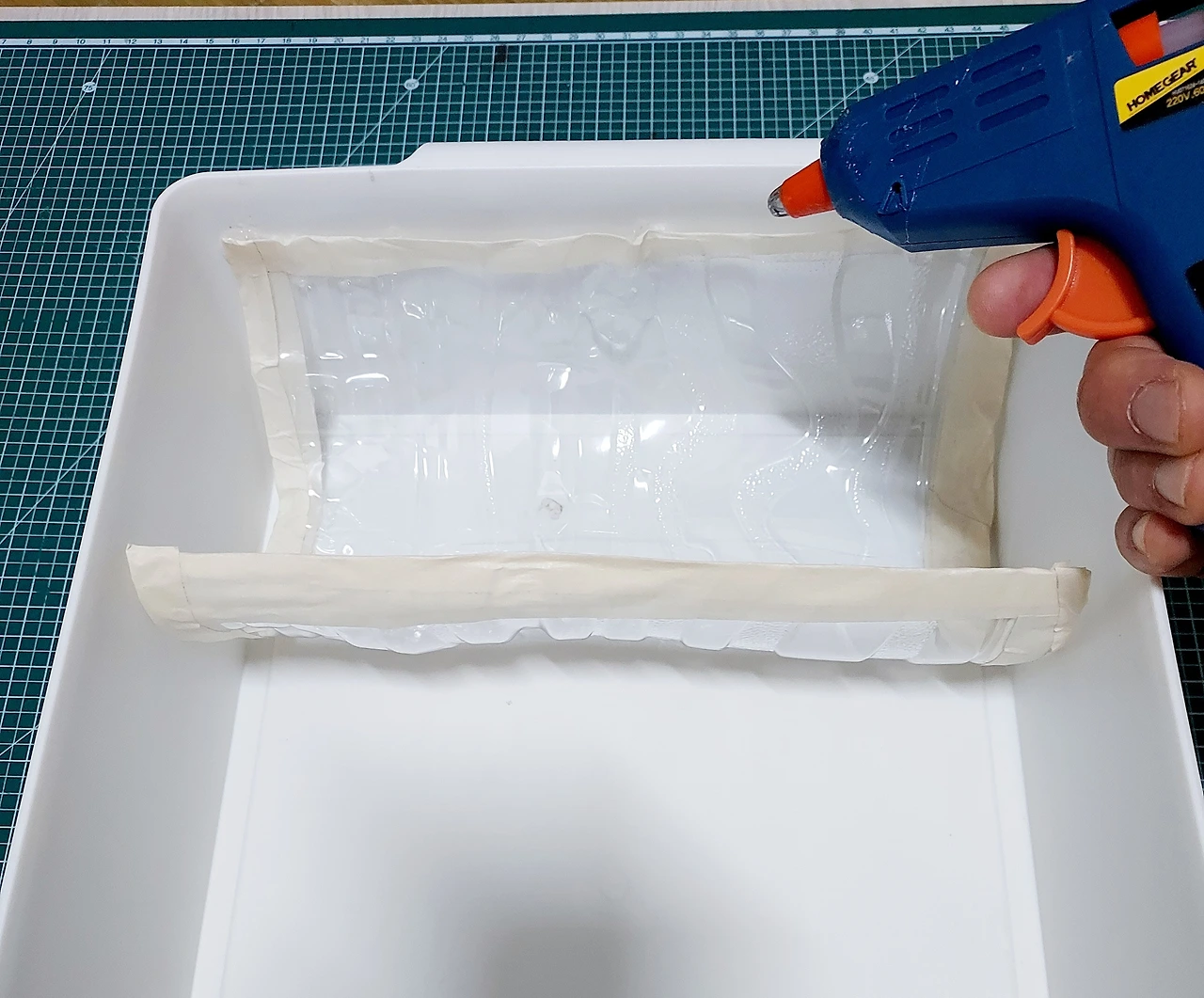 크기가 있는 집게핀은 2리터짜리 생수병을 잘라 담을 계획이다. 바구니 가로 크기에 맞게 위아래를 자른 생수병의 단면을 마스킹테이프로 마무리. 글루건을 이용해 바닥에 고정했다.