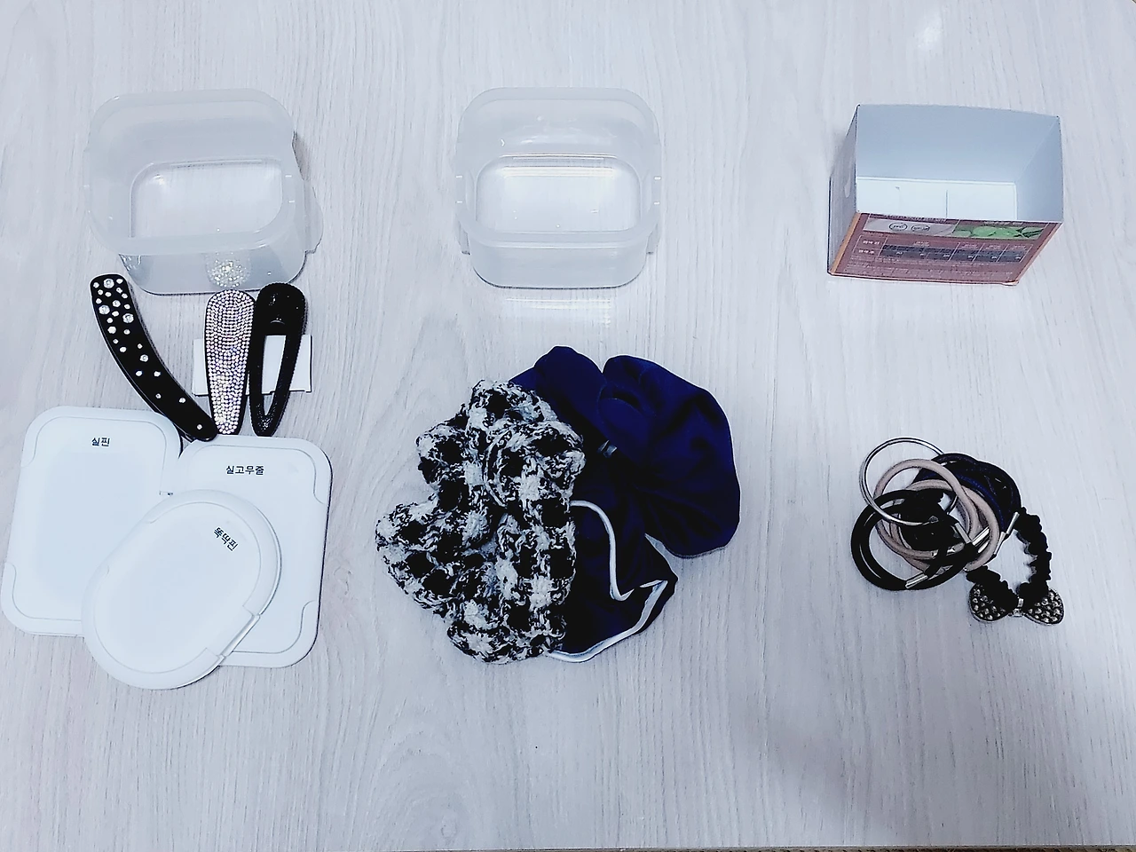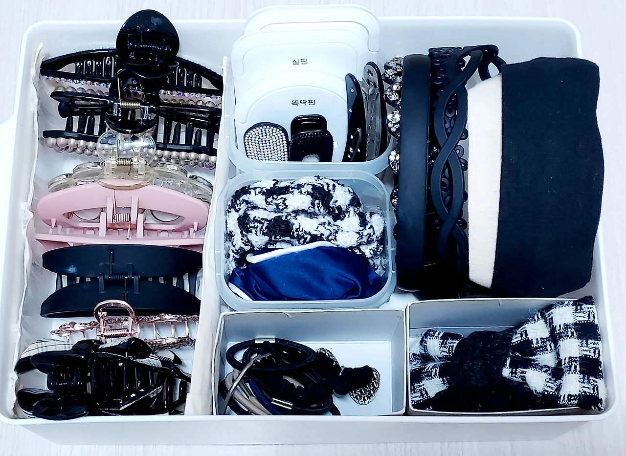 머리 길이는 변했지만 헤어액세서리는 예나 지금이나 변함없이 많다. 밴드, 고무줄, 집게핀, 똑딱핀 등 종류도 다양하다. 얘들은 정리를 해놔도 외출준비 한번 하면 흐트러지고, 어디론가 사라지는 게 일상이다. 모양과 크기가 달라서 그런 걸까? 특히 고무줄과 실핀은 쓰는 것보다 잃어버리는 게 더 많다. 고무줄부터 밴드까지 대대적으로 정리 한번 해야겠다.
