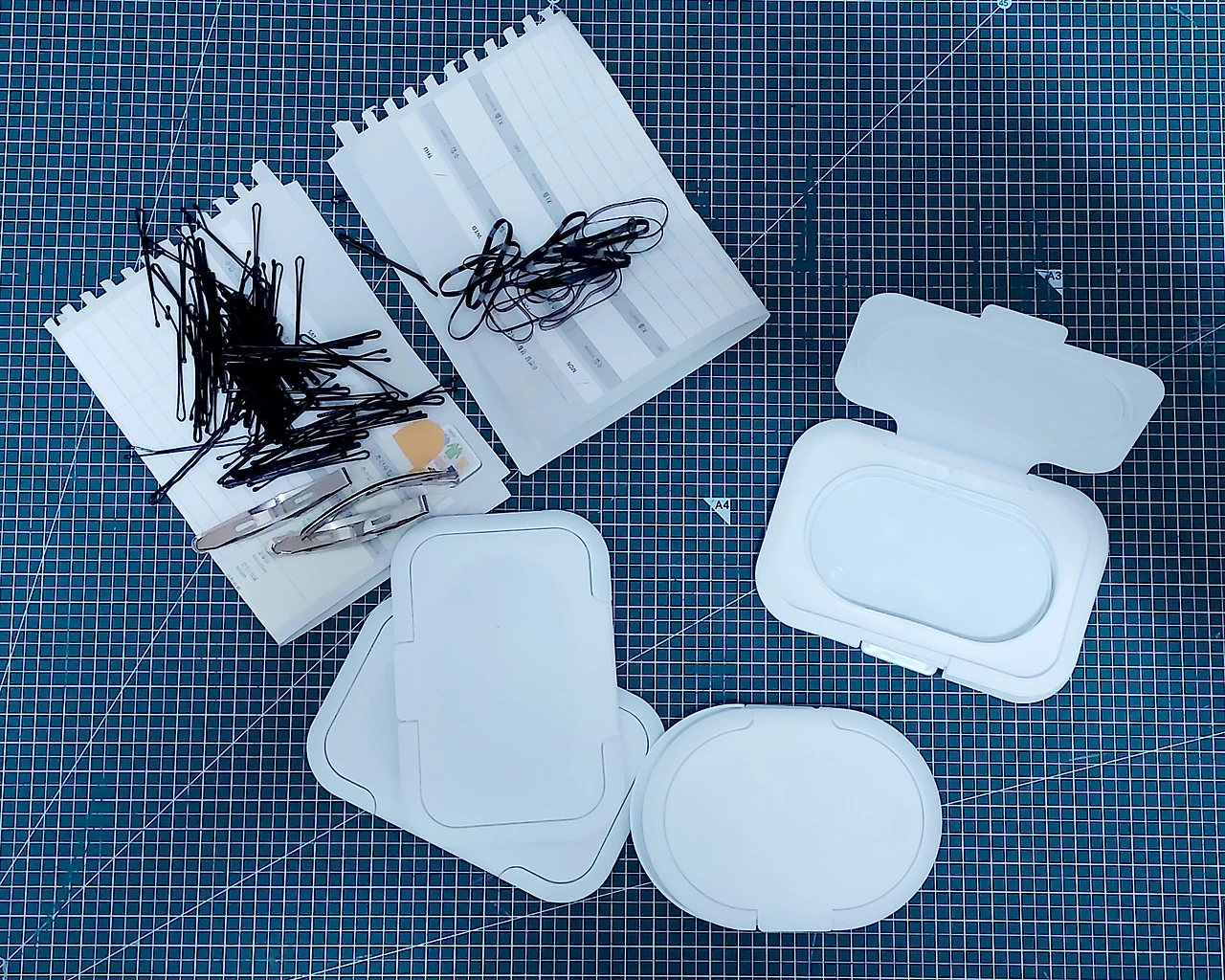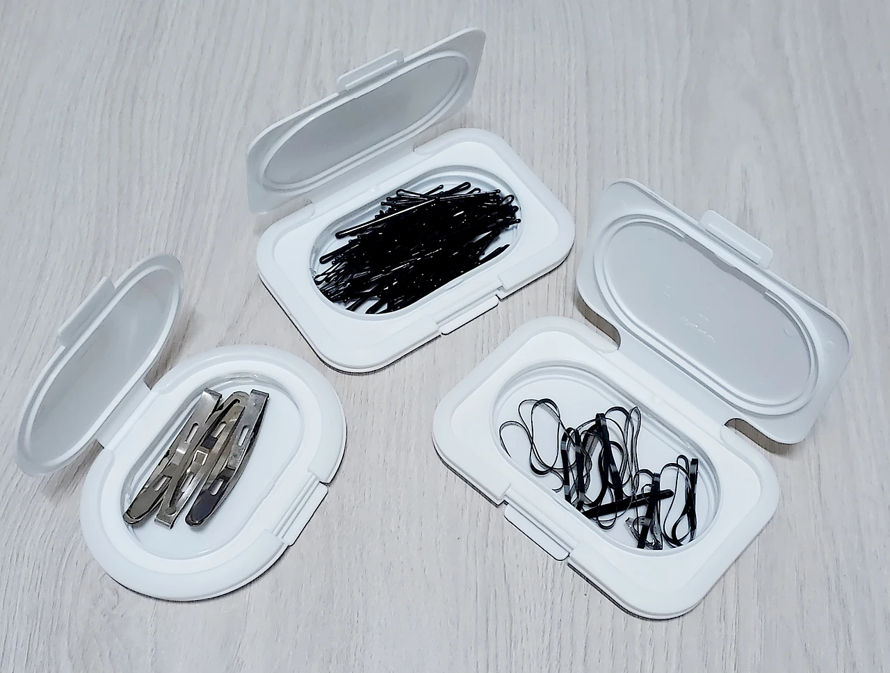다음은 맨날 잃어버려 짜증을 유발하는 실핀, 집게핀, 실고무줄 차례다. 크기가 작은 아이템들은 어디로 도망가지 않게 보관하는 것이 중요하다. 위가 뻥 뚫린 상자에 넣으면 꺼내다가 흩어지기 쉬우므로 물티슈 캡 2개를 붙여 넣기로 했다.