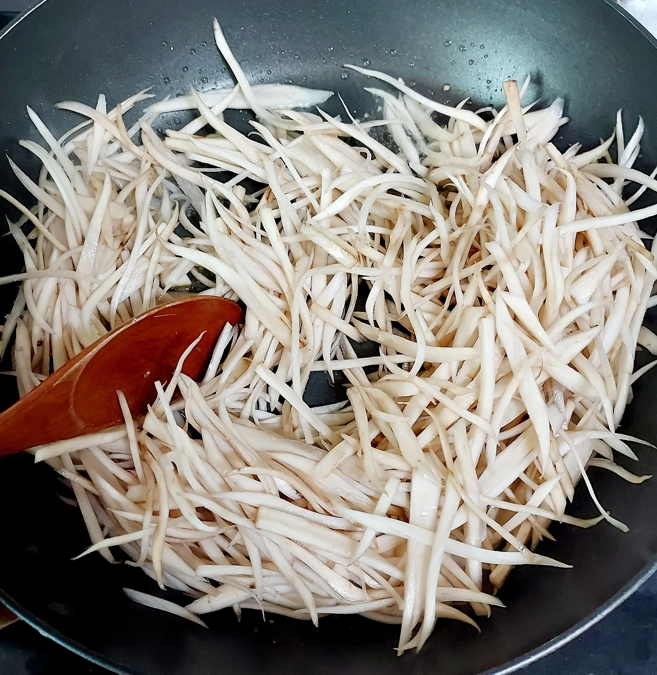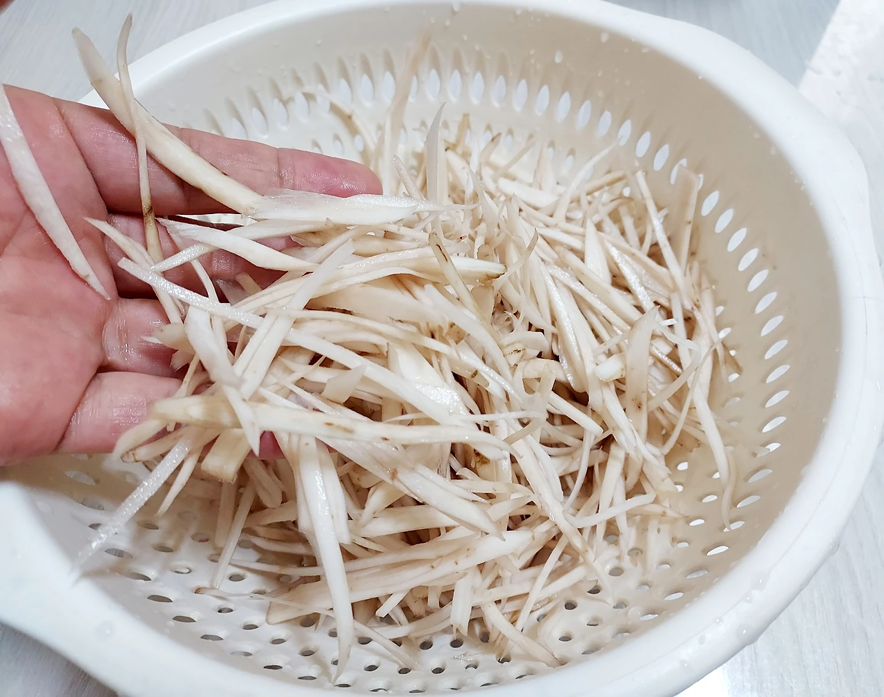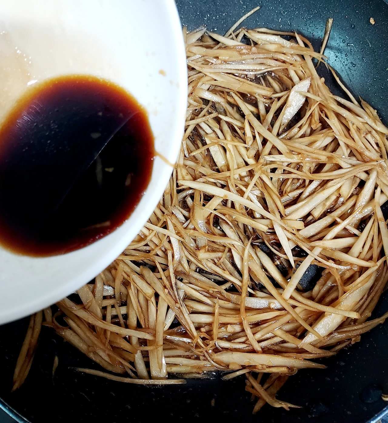 껍질을 벗긴 우엉을 조심조심 채 썰었더니 크게 잡아서 3줌 정도 나왔다. 우엉은썰자마자 색이 변한다. 갈변현상을 막고 특유의 아린맛을줄여주기 위해 식초를 탄 물에 담가두는 방법을 찾아볼 수 있다. 근데난식초물에 담근 것과 그렇지 않은 것의 차이를 못 느껴채 썬 우엉을 사진처럼 그냥 맹물에 씻어 바로 조리하고 있다.