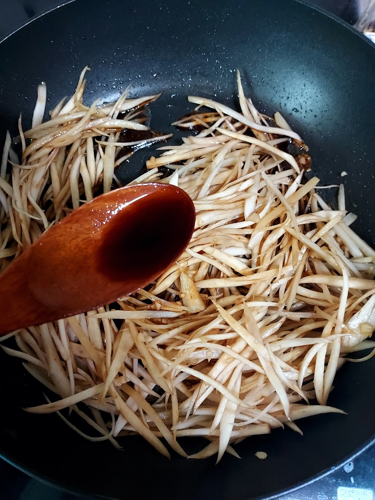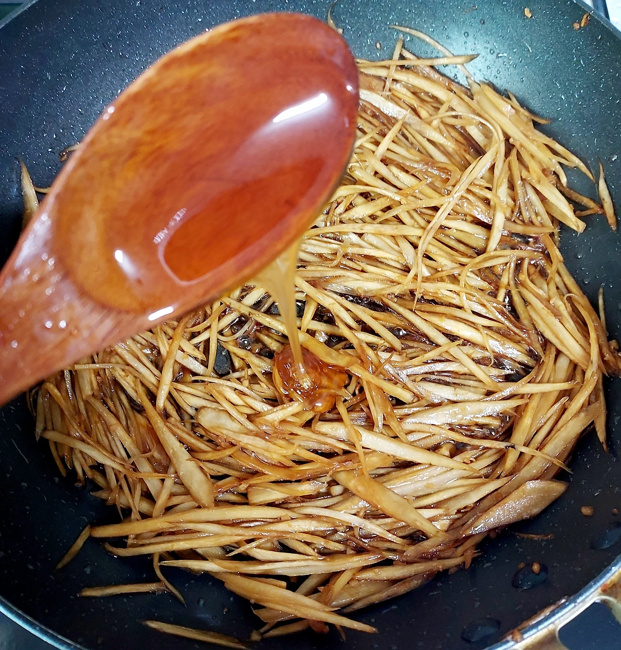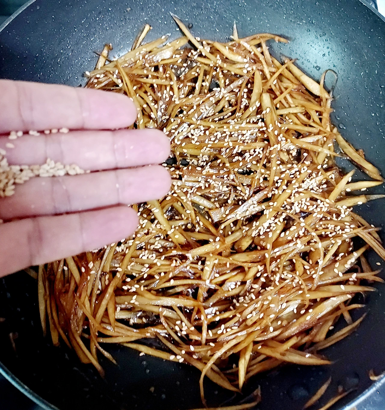 껍질을 벗긴 우엉을 조심조심 채 썰었더니 크게 잡아서 3줌 정도 나왔다. 우엉은썰자마자 색이 변한다. 갈변현상을 막고 특유의 아린맛을줄여주기 위해 식초를 탄 물에 담가두는 방법을 찾아볼 수 있다. 근데난식초물에 담근 것과 그렇지 않은 것의 차이를 못 느껴채 썬 우엉을 사진처럼 그냥 맹물에 씻어 바로 조리하고 있다.