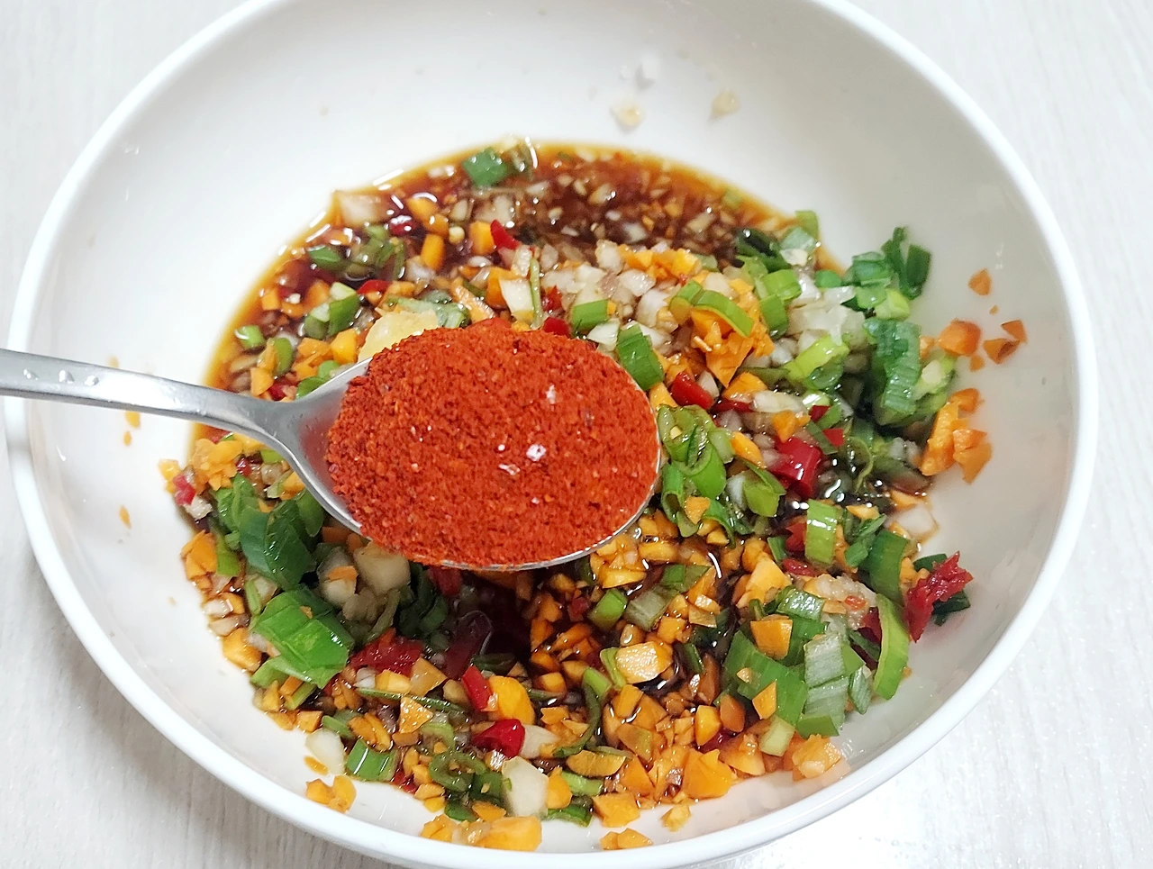 간장양념에 채소 넣고 다진 마늘 1수저. 고운 고춧가루 듬뿍 1수저 넣고 섞기.