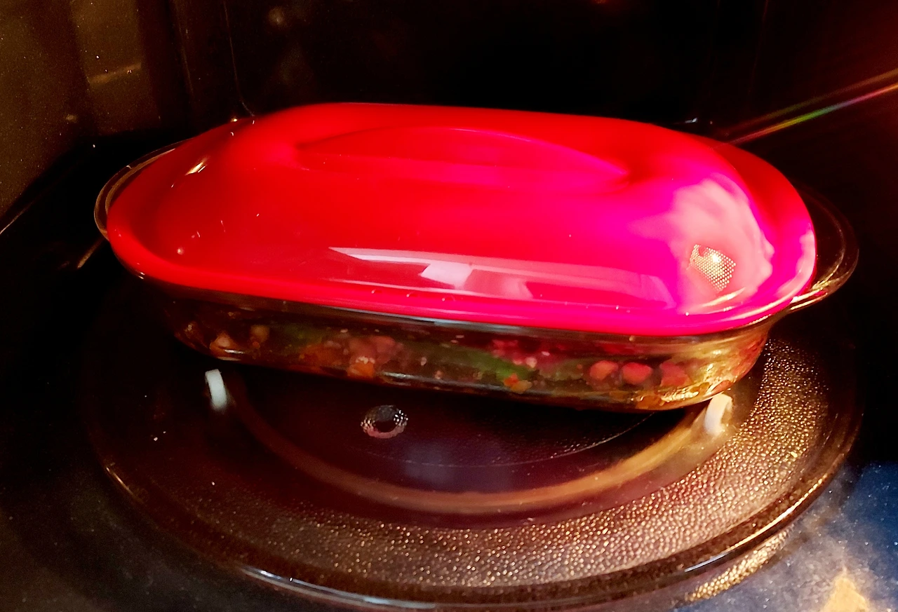 양념장을 바른 깻잎. 뚜껑을 닫은 용기를 전자레인지에 넣고 2분 돌리고 꺼내서
