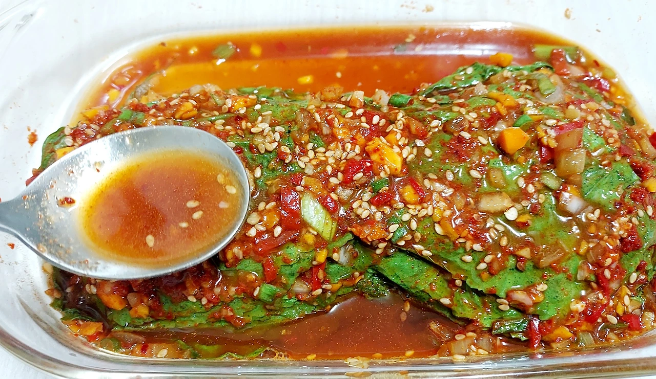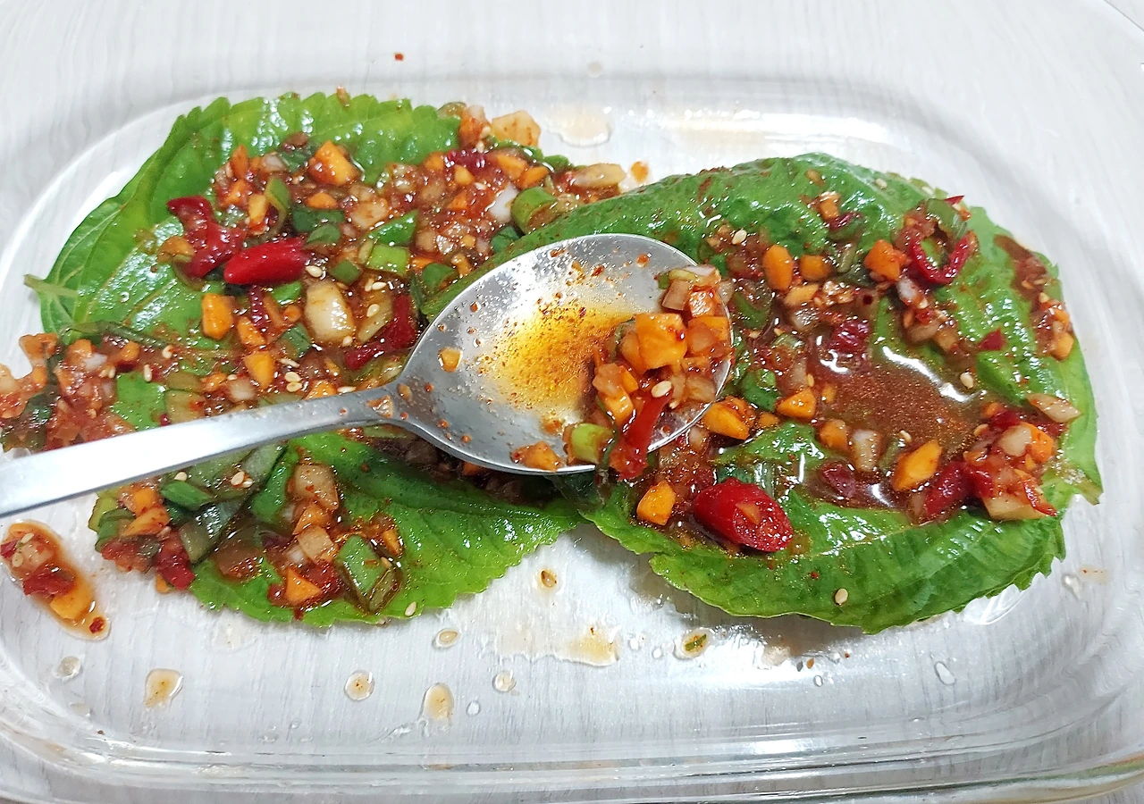 조리가 끝난 깻잎찜은 바로 반찬통에 옮기지 말고, 양념이 충분히 배이게 용기 뚜껑을 닫은 채로 식을 때까지 둔다.뜸을 들인다고 생각하면 되겠다.