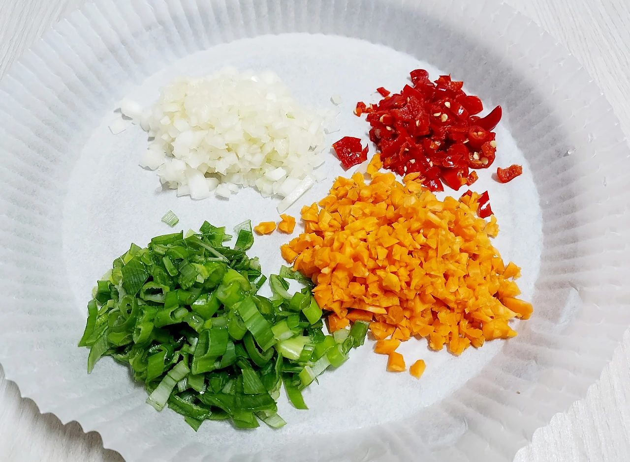 양념장에 들어갈 채소로 양파 반 개, 홍고추 3개, 당근 반 개를 다지고, 대파도 썰어서 반줌 정도 넣는다. 우리 집 대파통에 푸른 것들만 있어 썼는데, 흰 부분을 넣는 게 보기에 좋다. 꼭 필요할 때마다 떨어지는 것은 무슨 조화 속인지...