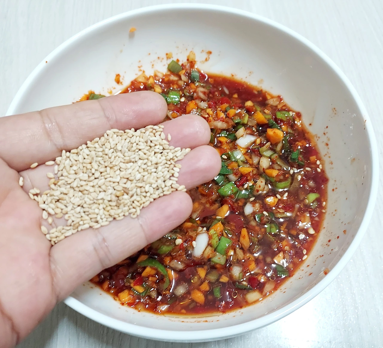 참기름 반수저와 깨소금 듬뿍 넣으면양념장 제조는 마무리된다.