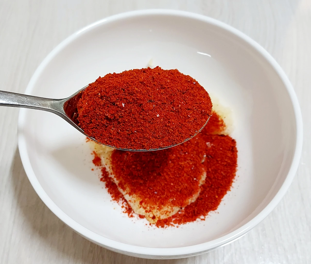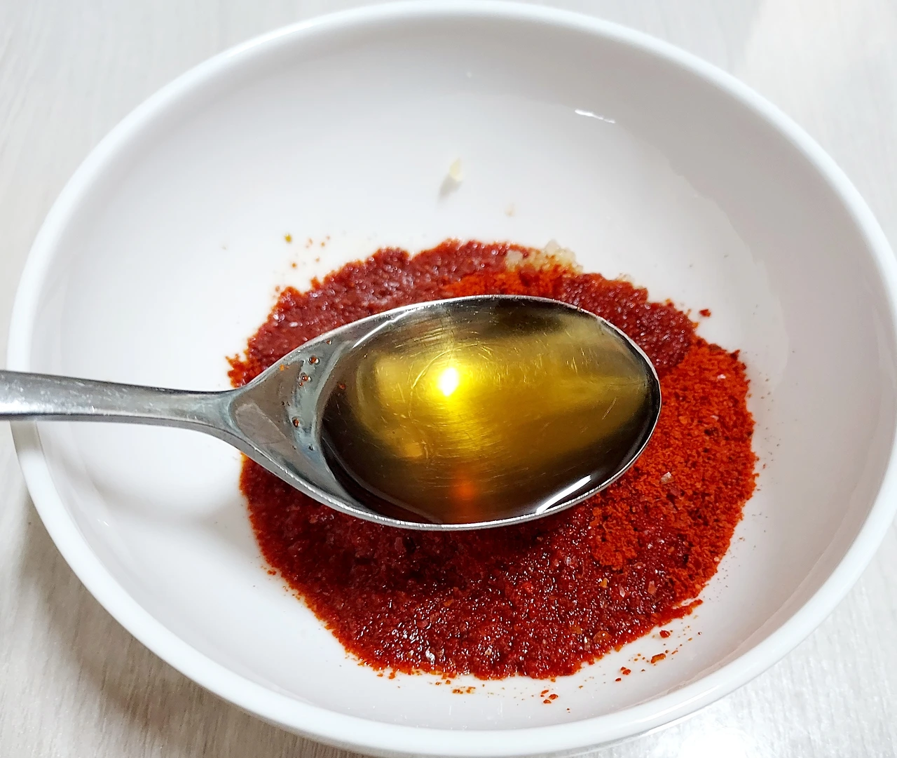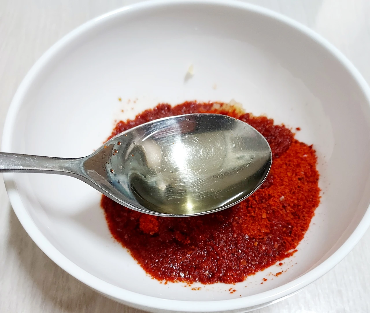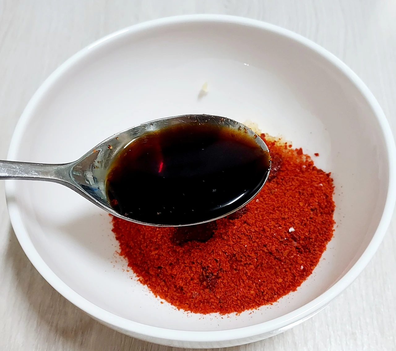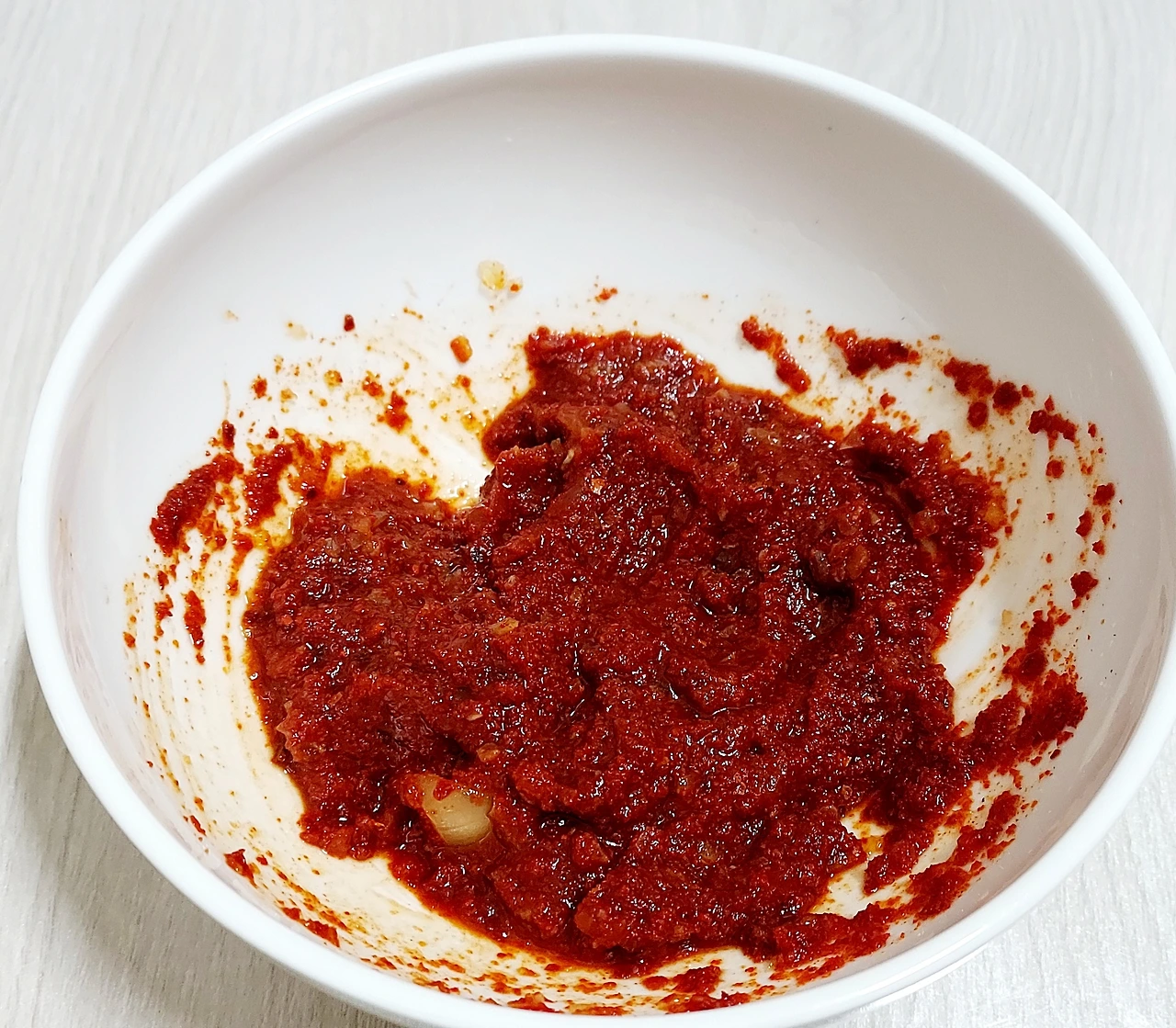 다진 마늘 1수저반, 고춧가루 3수저, 진간장 2수저, 참치액 또는 멸치액젓 반수저, 맛술3수저, 매실액1수저.