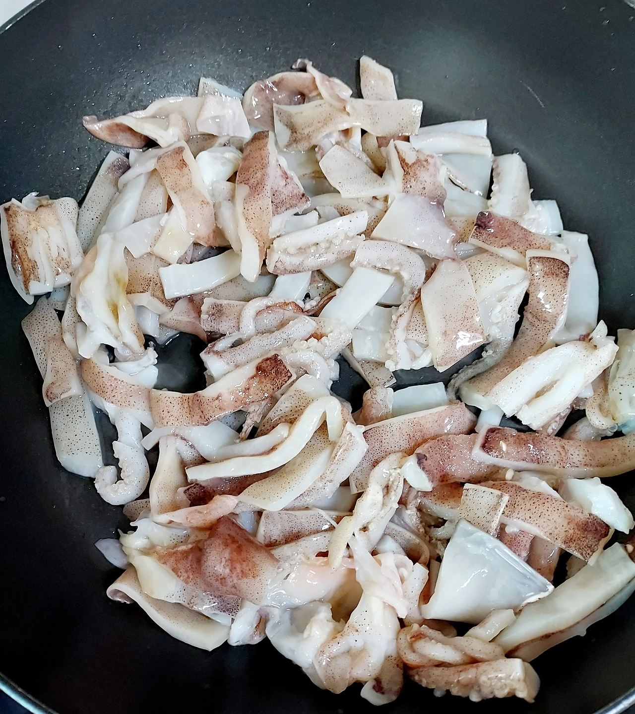 국물을 버린 프라이팬에 식용유를 넉넉히 둘러 오징어에 기름 코팅을 한 다음