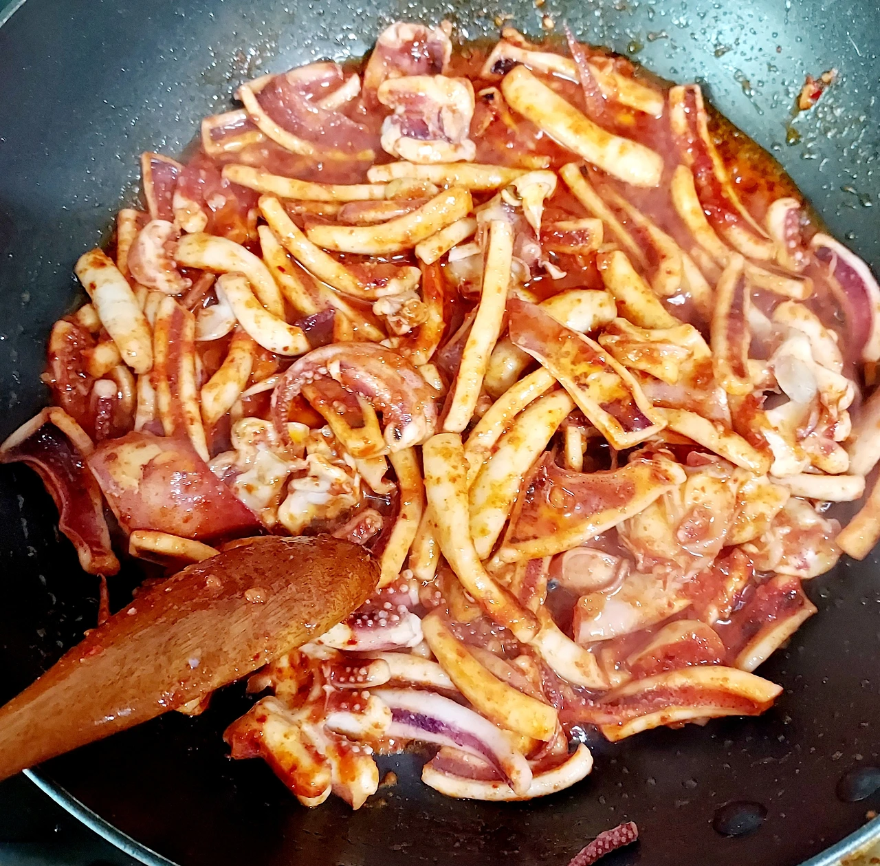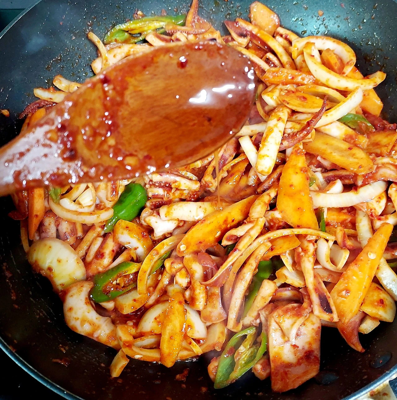 오징어에 양념맛이 스며들게 중간불에서 볶아준다. 난 오징어볶음에 끈적함을 더하는 전분물을 넣지 않는다. 저 상태에서 프라이팬 바닥에 국물이 없어질 때까지 볶다가