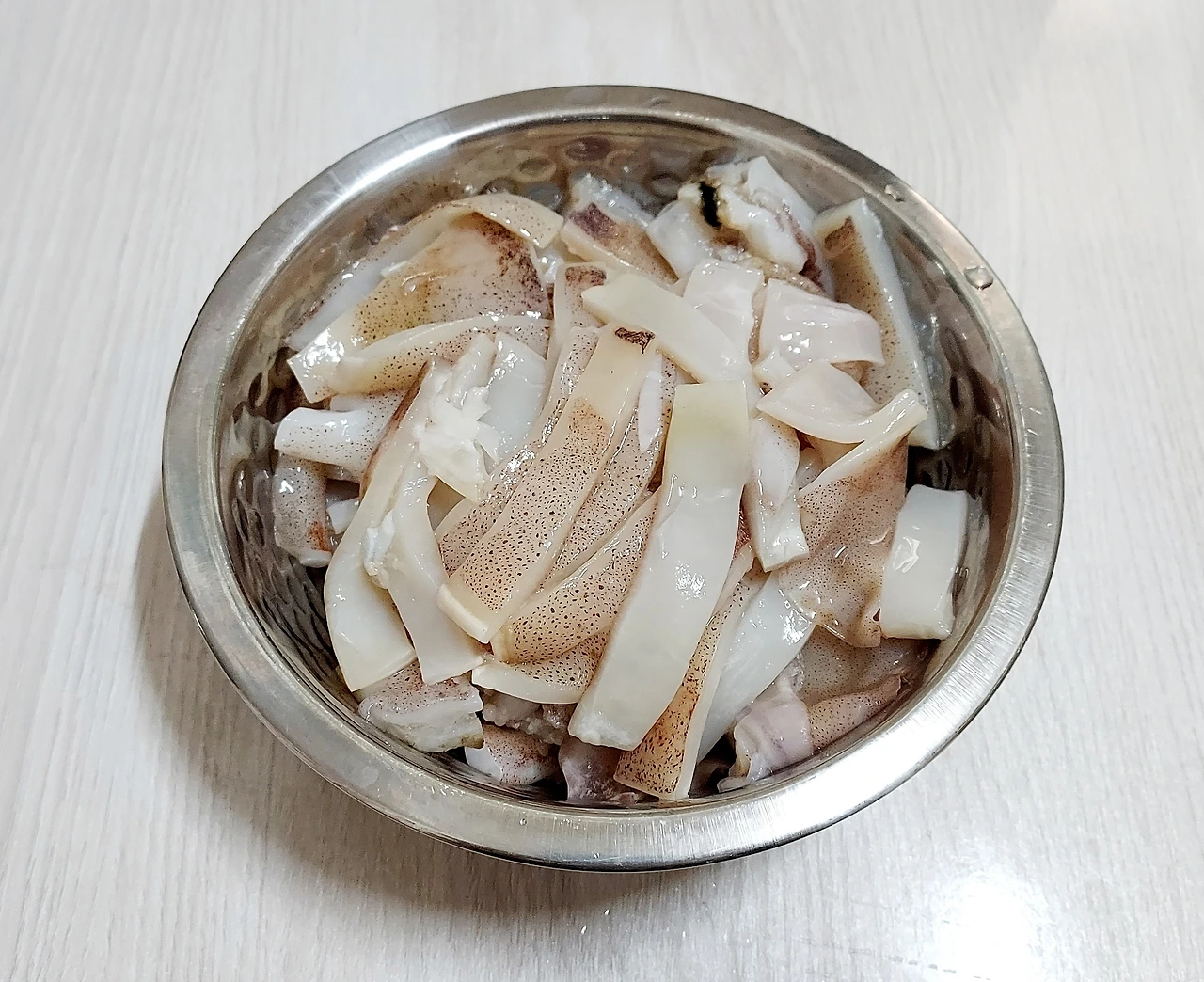 이것은 마음의 평화와 순조로운 요리 진행을 위해 사다 먹는 냉동 오징어 되겠다. 싹 손질해서 먹기 좋게 썰어 놓은 오징어 3마리. 오늘은 매콤하게 볶아야겠다.