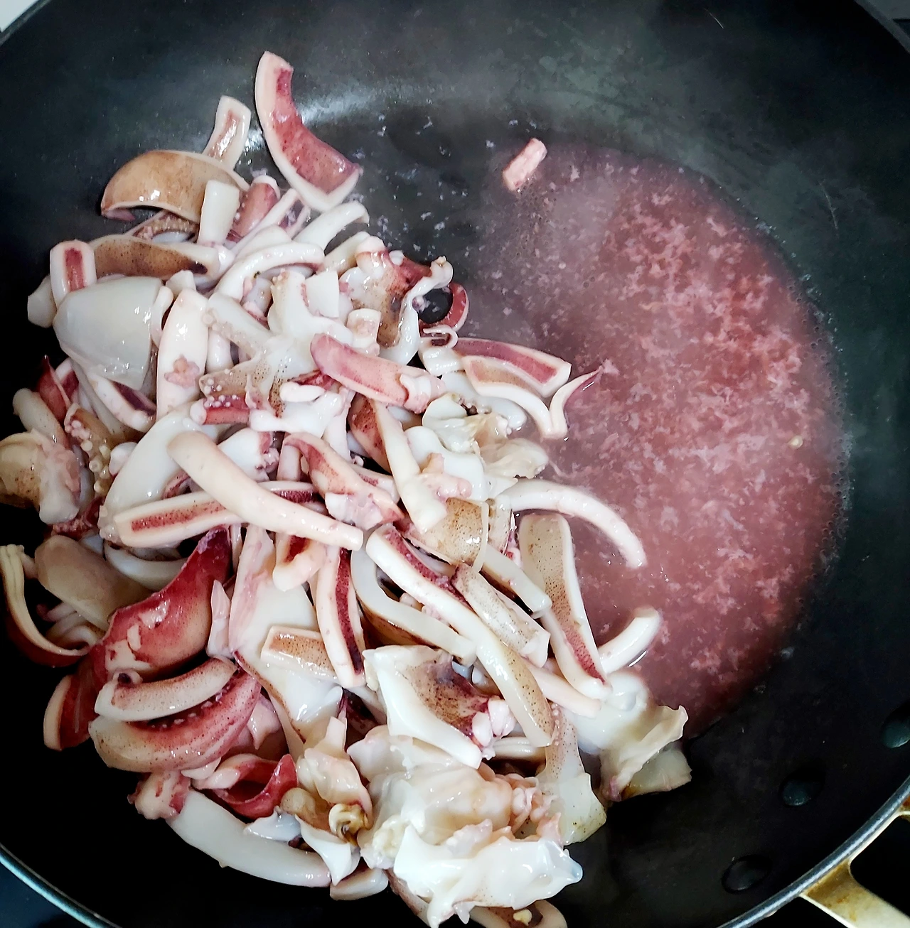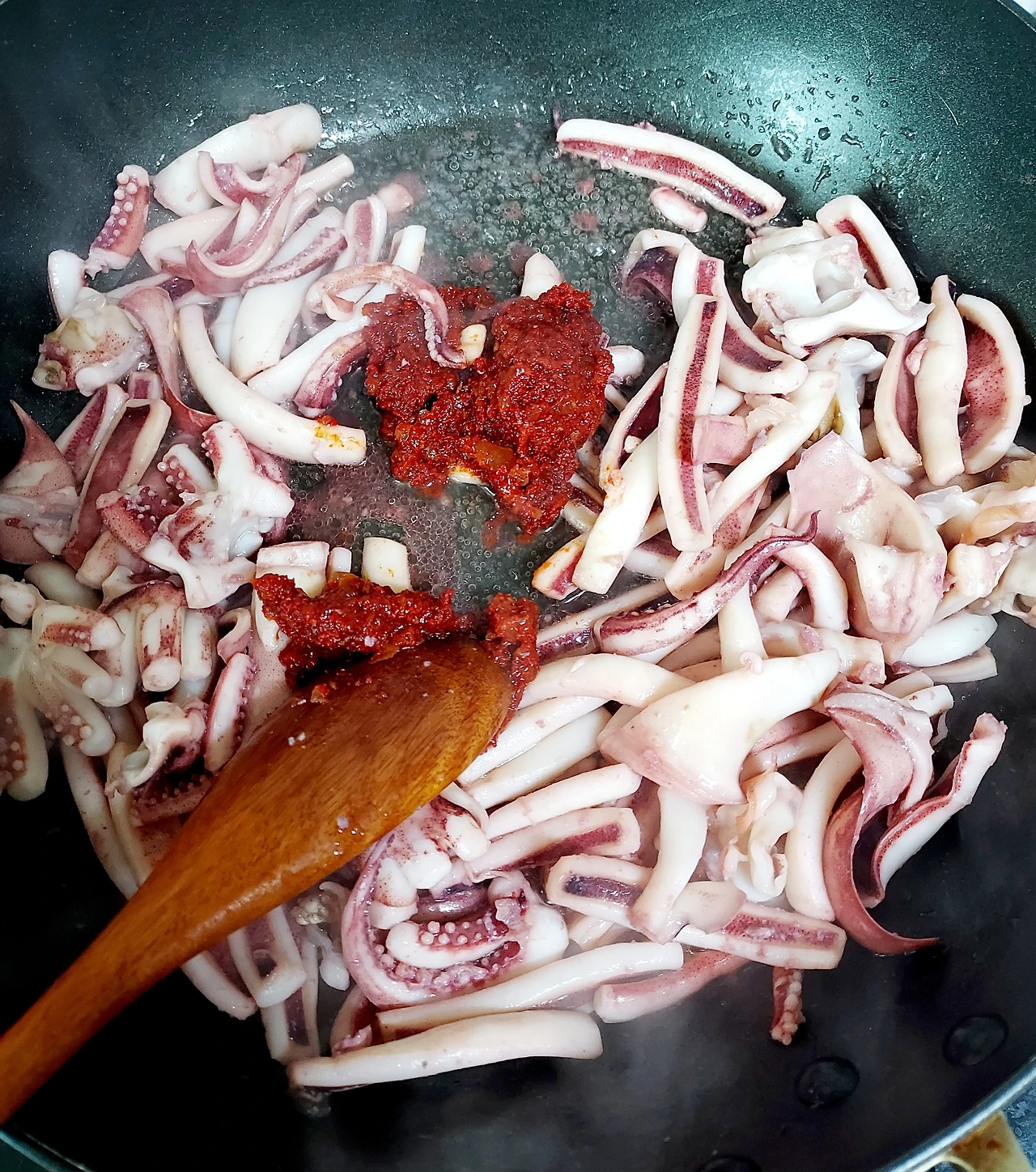 오징어가 익으면서 나온 국물을 버리는 것이다. 이때 맛술을 조금 넣어 비린내도 날려준다. 오징어는 색깔이 변하면 1분 정도 후다닥 볶고 국물 버리기.