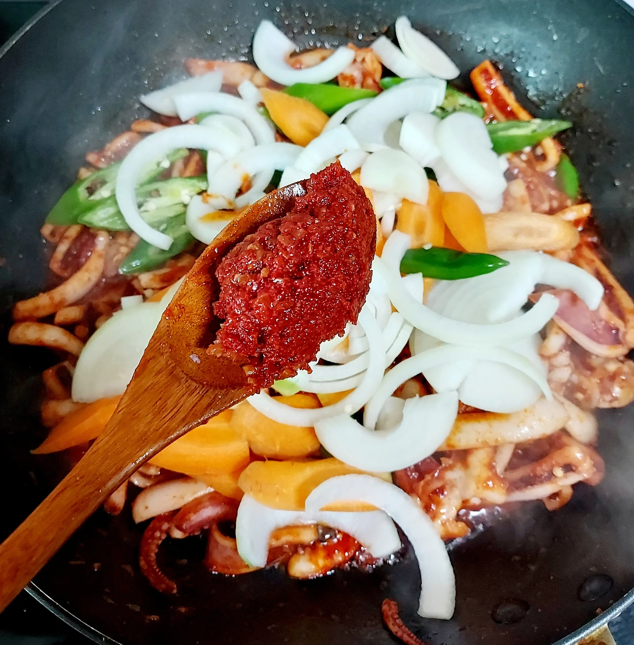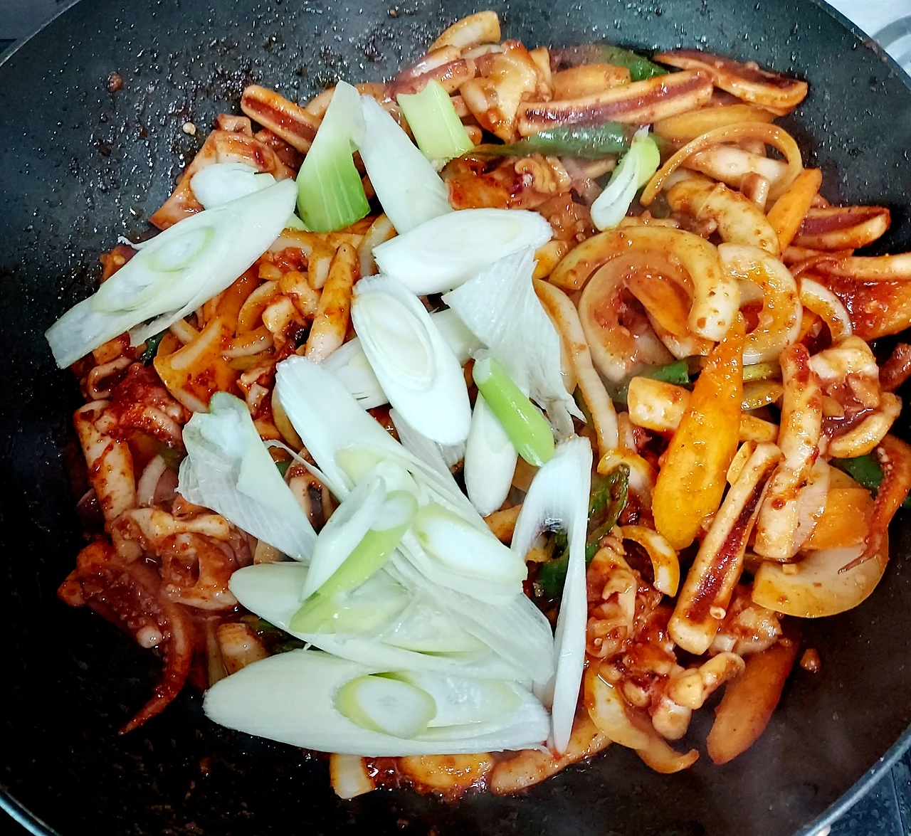 채소와 나머지 양념장 넣는다. 오징어에 양념맛을 충분히 줬기 때문에 채소는 오래 두지 않는다.