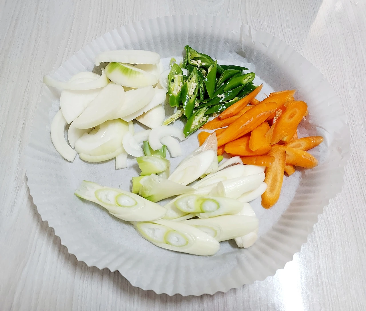 오징어볶음에 넣을 채소로 청양고추, 당근, 대파 흰 부분, 양파 썰어서 한 줌씩. 제육이나 오징어 볶음에 넣는 대파는 미끈거리는 파란 부분보다 흰 부분을 넣는 것이 좋다.