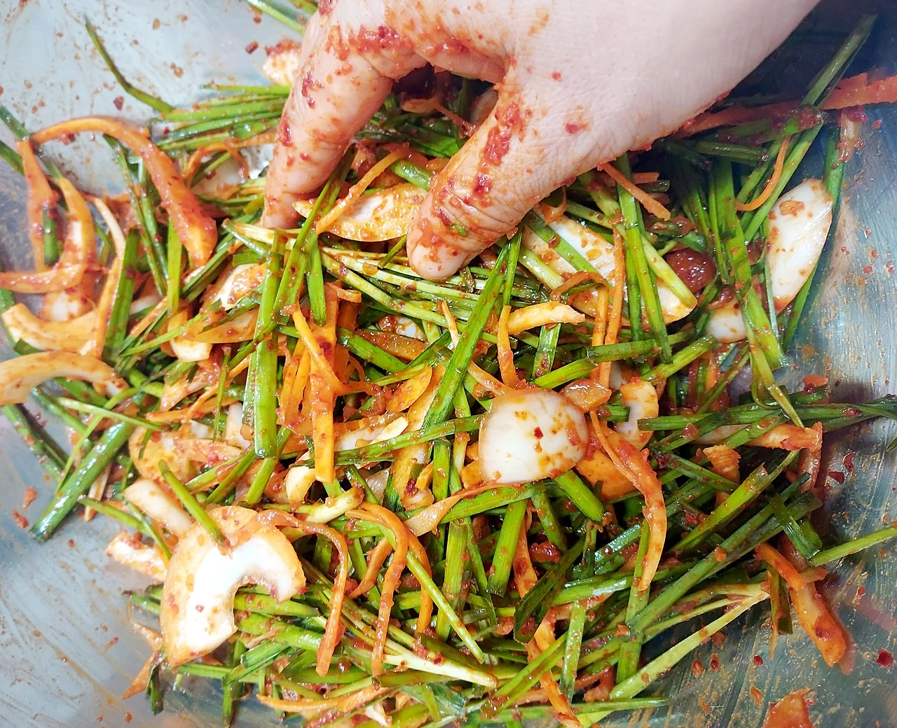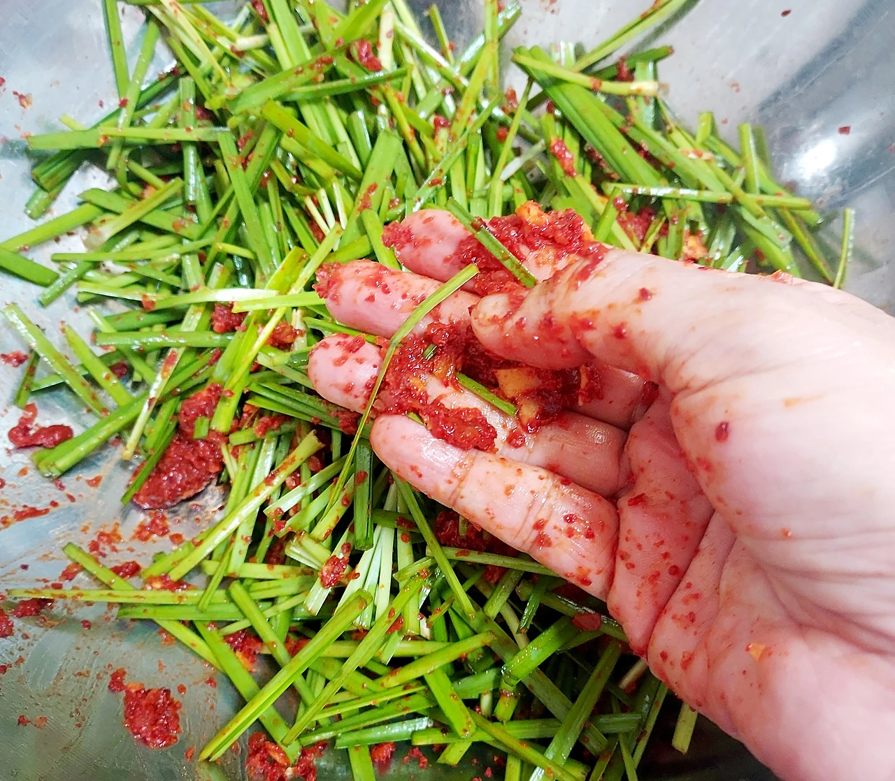 난 양념이 뻑뻑하다 싶으면 손바닥에 생수를 겨우 묻을 정도로만 몇 번 발라서 무치기도 한다.