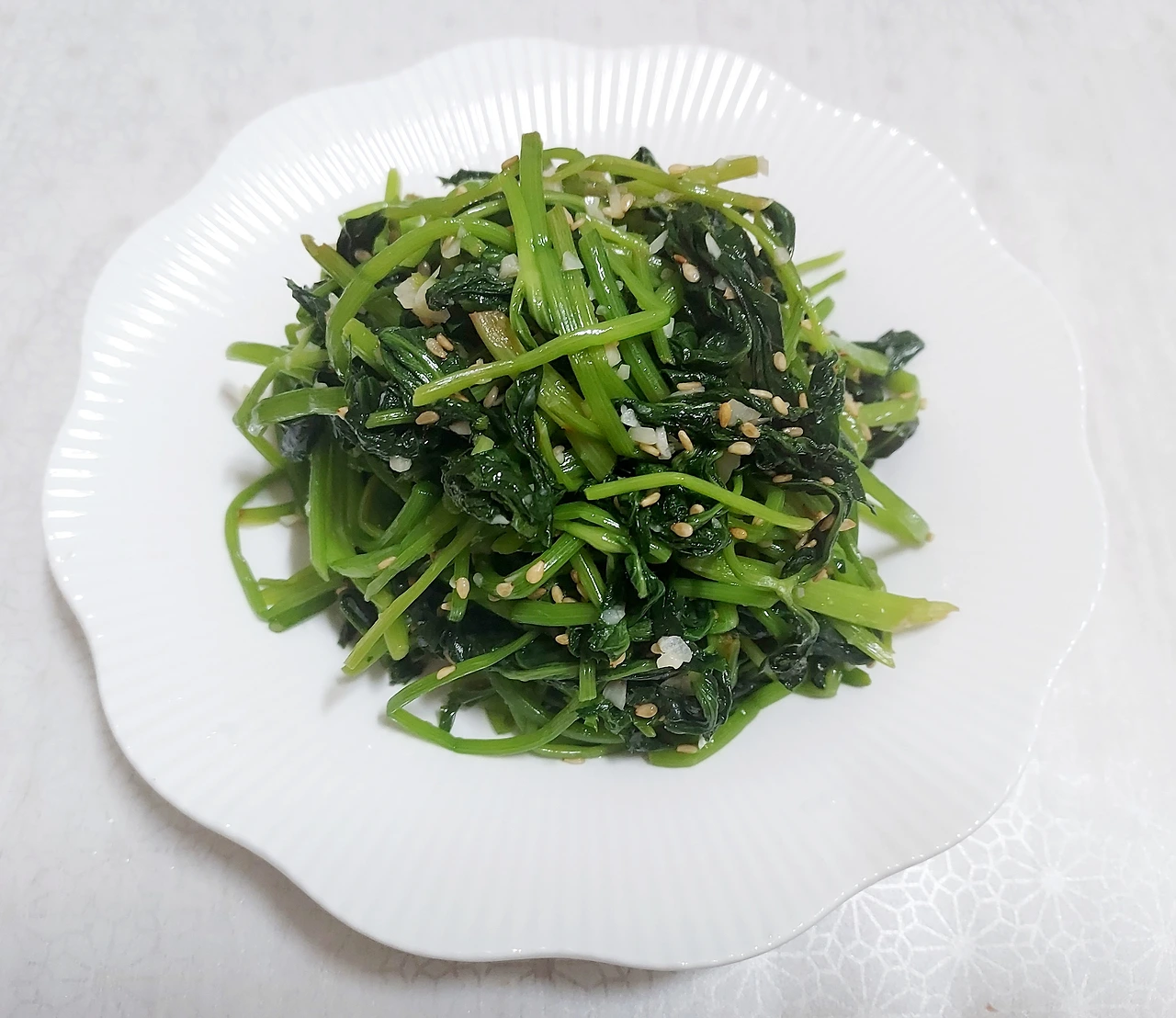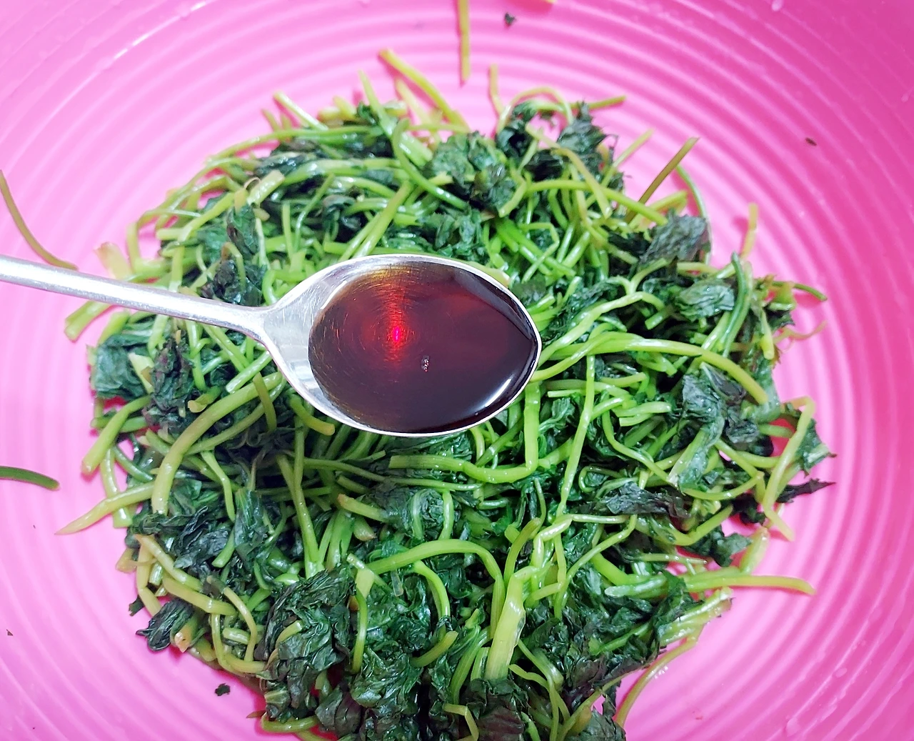 데친 나물에 있는 물기를 지나칠 정도로 제거하면 질겨지니 적당히 촉촉할 정도로만 짜서 먹기 좋게 썰어준다. 이렇게 해서 나온 나물이 세 주먹 정도 된다.