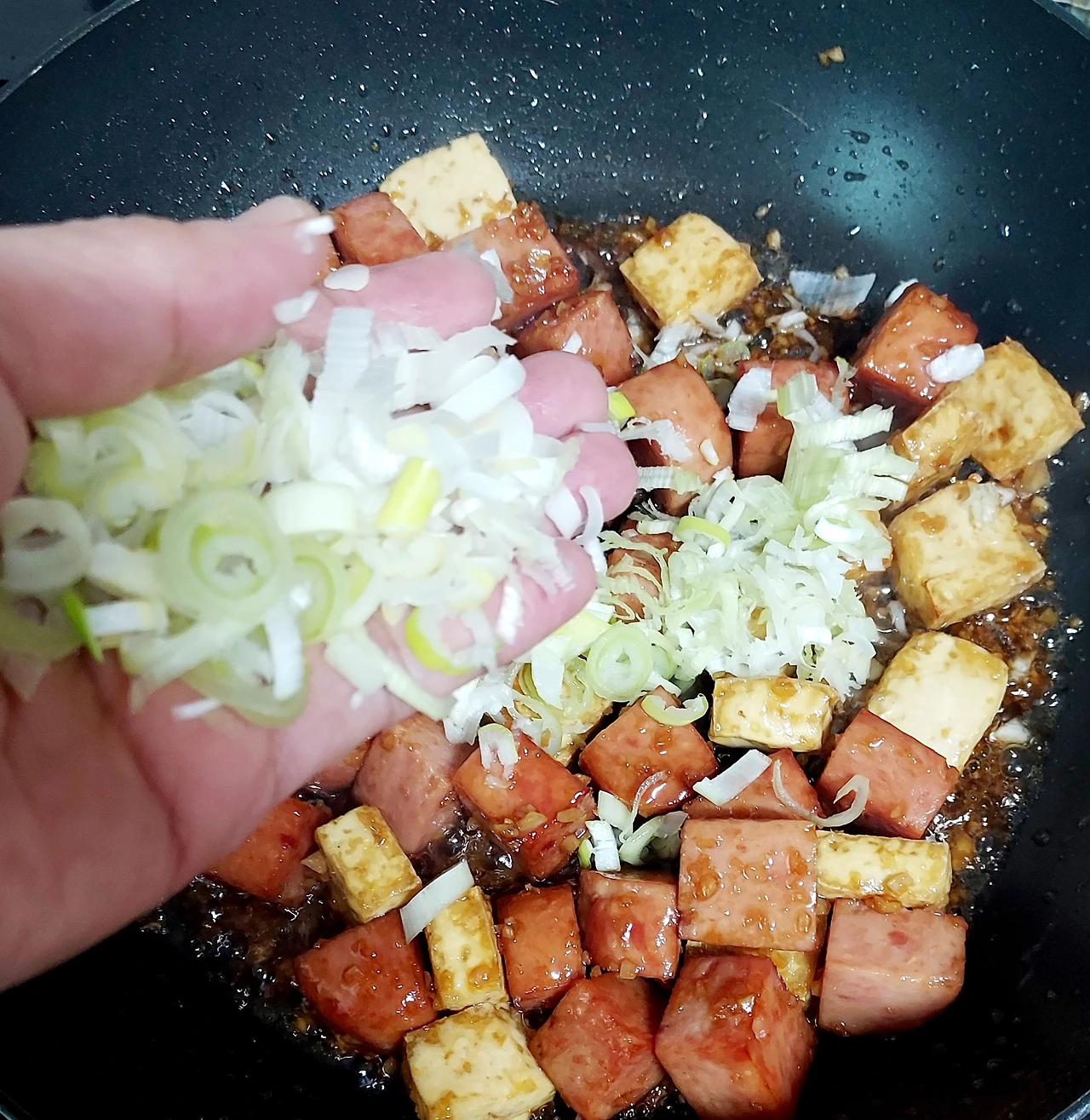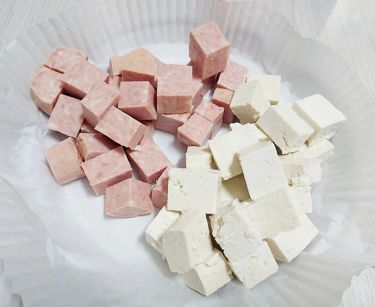 햄과 두부를 볶기 전에 재료를 각각