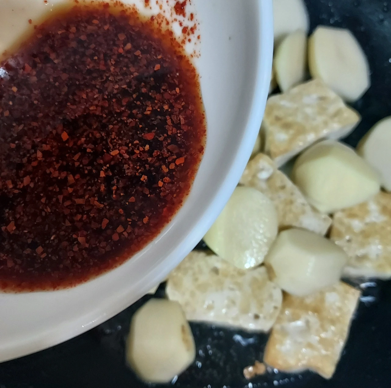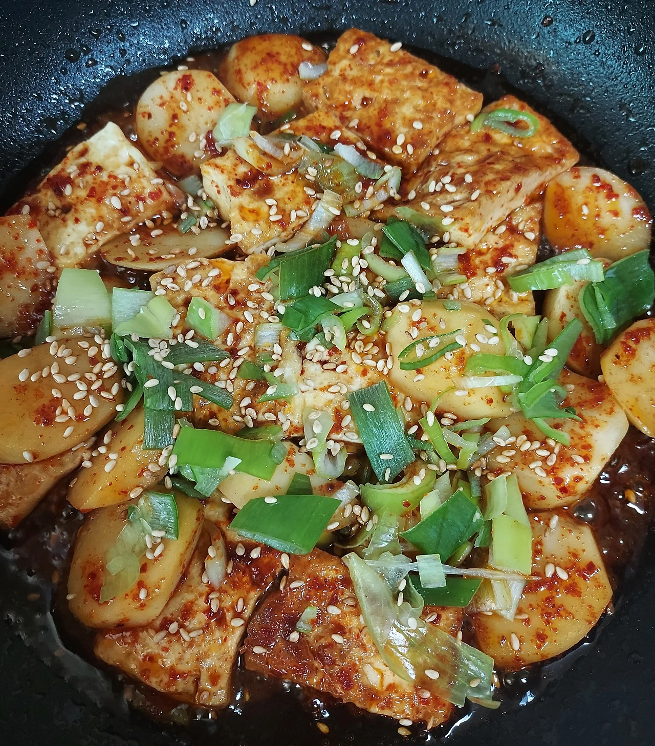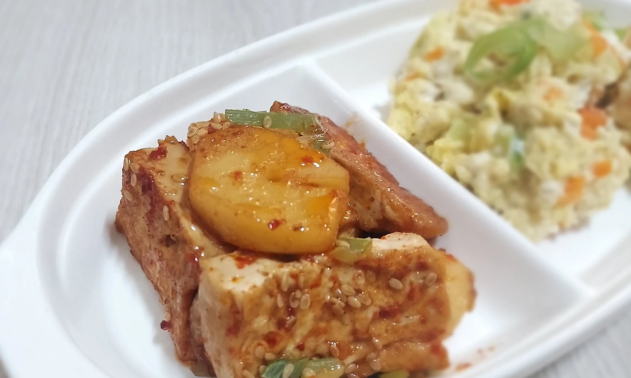 식용유 한수저와 들기름 반수저를 두른 팬에 두부를 넣고 노릇노릇 구워준다. 여기에 감자 넣고 양념장(진간장 2수저, 생수 2수저, 올리고당 1수저, 맛술 반수저, 후추 약간,고춧가루 반수저)을 넣고 약한불에서 양념장을 끼얹으면서 졸여준다.