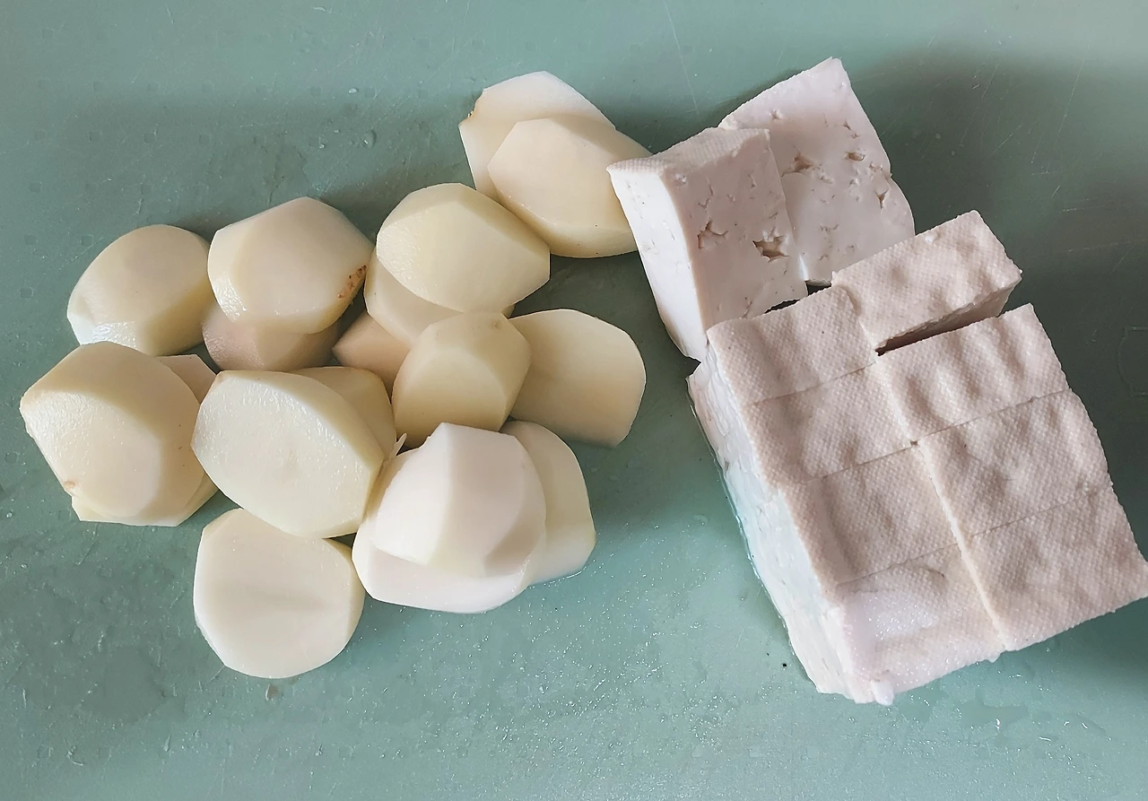 노릇노릇 구운 두부와 포슬포슬한 감자를 조림하면 씹고 먹는 재미가 좋아 즐겨 먹는다. 두부 반모와 감자 3개를 적당한 크기로 썰기.
