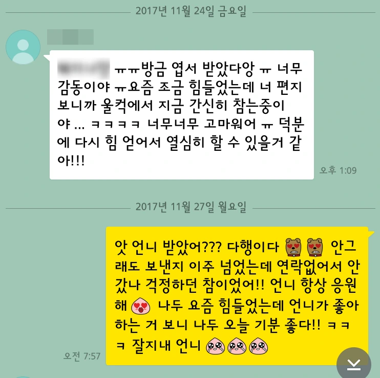엽서를 쓰는 그 시간동안만큼은 온전히 내 엽서를 받을 친구만 생각할 수 있었다. 주변의 그 어떤 소음도, 현재 나의 상황도 모두 잊은 채, 오로지 그녀 혹은 그녀와 함께 있던 나의 순간들만이 있었고, 나는 그 기억들을 가만가만 만졌다. 정말이지 행복한 순간이었다. 내가 좋아하는 사람에게, 우리가 가장 행복했던 순간들을 회상하며 엽서를 쓰는 그 순간은, 내가 발견한 새로운 행복이었고 소위 말하는 ‘소확행(소소하지만 확실한 행복)’이었다. 엽서를 쓰면서 나는 철없던 15살로 돌아가기도 하고, 미래 걱정에 고민이 많던 20대 초반으로 돌아가기도 했다. 지금과는 다른 나의 과거를 함께 했던 친구, 내가 힘들었을 때 들었던 말 한마디, 만날 때마다 받았던 기분 좋은 에너지들이 그대로 생각났다.