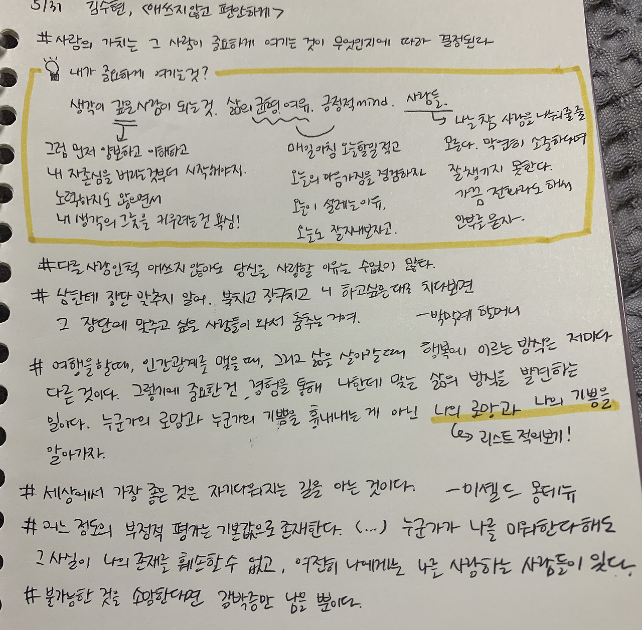 책을 읽는 내내 작가의 생각 옆에 내 생각도 같이 덧붙였다. 오랜만에 책에 메모를 하며 적극적으로 읽으니 작가와 대화하면서 읽는다는 게 뭔지 실감났다. 다음번에 다시 이 책을 열었을 때는 또 어떻게 느껴질까. 끄적인 내 마음은 또 어떻게 달라져있을까, 벌써부터 궁금해진다.