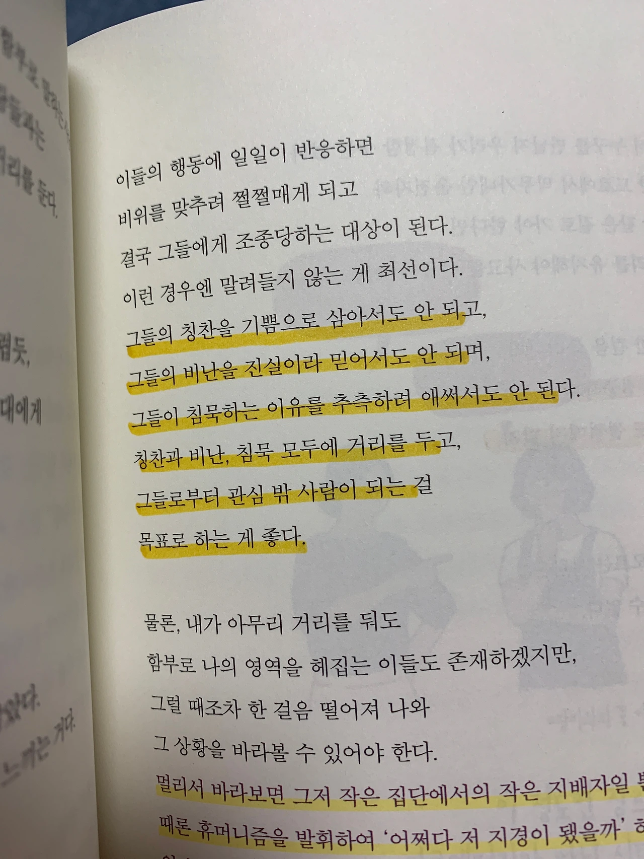 김수현 작가는 이미 <나는 나로 살기로 했다>는 베스트셀러를 쓴 작가로, 전작에서도 상처받지 않고 당당하고 건강한 나로 살아갈 방법을 제시한 바 있다. 그녀의 4년만의 신작이 여전히 좋은 이유는, 그런 책을 쓴 작가라고 해서 그 방법을 다 지켜가며 살지 못하고 있다는 사실이었다. 여전히 그는 삶에서, 사람들에 치여가면서 고군분투하고 있었다. 하지만 책에는 그녀가 이미 겪었던 삶의 시행착오들을 그대로 담아내고 있었다. ‘나도 너처럼 그런 적 있어. 그때 난 이렇게 했는데, 넌 어때?” 라고 친구처럼 물어봐주고 조언해주는 것 같았다. 역사속에 훌륭한 사람의 명언 한마디보다 더 귀담아 들을 수 밖에 없는 진심어린 조언이었다.