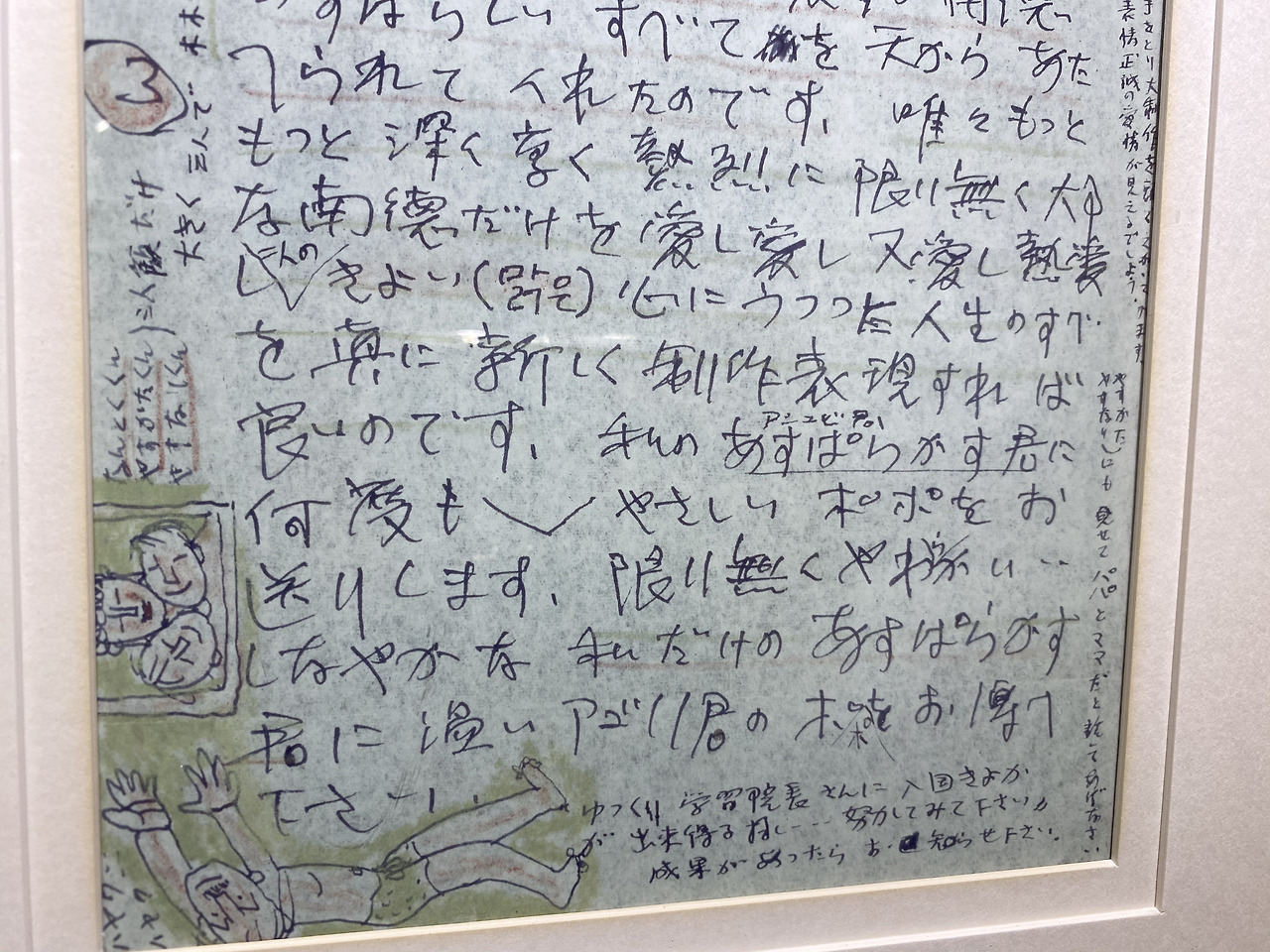 아고리(이중섭 자신)는 만족해서 마음속으로 혼자 싱글벙글 웃고 있다오. 사람들은 아고리가 제 아내만을 생각하고 있다고 여길지도 모르겠지만 아고리는 당신과 같은 사랑스런 애처와 오직 하나로 일치해서 서로 사랑하고, 둘이 한 덩어리가 되어 참 인간이 되고, 차례차례로 훌륭한 일 (참으로 새로운 표현과 계속해서 대작을 제작하는 것)을 하는 것이 염원이오. 자기가 가장 사랑하는 소중한 애처를, 진심으로 모든걸 바쳐 사랑할 수 없는 사람은 결코 훌륭한 일을 할 수 없소. 독신으로 제작하는 사람도 있지만 아고리는 그런 타입의 화공은 아니오. 자신을 올바르게 보고 있소. 예술은 무한한 애정의 표현이오. 참된 애정에 충만함으로써 비로소 마음이 맑아지는 것이오.