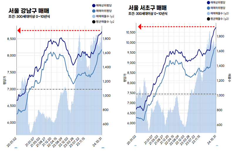 출처 : 손품왕 데이터 (강남, 서초 신축 호가 흐름)