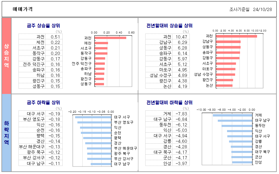 ✔️ 서울 주요 지역 위주로 가격 상승 중. 과천, 서초의 가격 상승이 두드러짐.