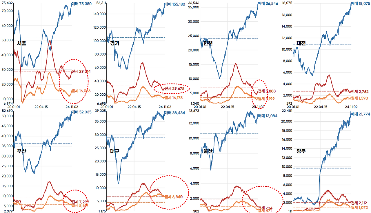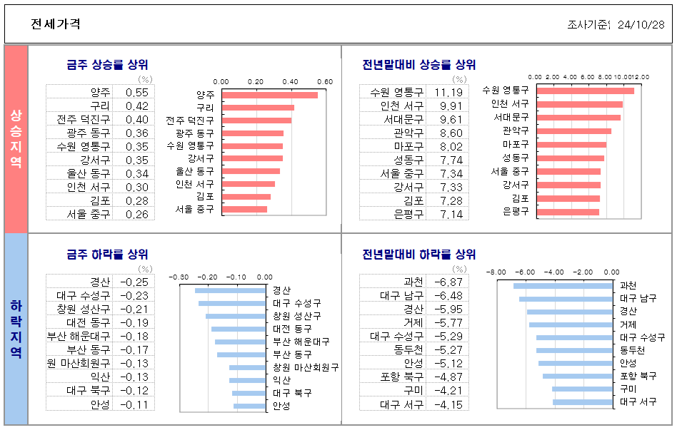 ✔️ 수도권과 일부 광역시 전세가 상승 중. 중소도시는 전주 빼고 아직 정신 못 차리는 중.