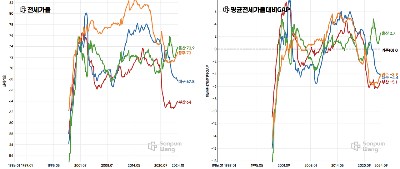 추가로 부산, 대구, 울산의 임대 매물들이 상당히 많이 줄어들고 있습니다. 울산의 경우 공급이 없어서 매물량이 줄어드는 것으로 보이고, 부산, 대구는 매물량이 점차 소진되고 있습니다. 지속적으로 임대 매물량이 줄어들어 전세가가 상승하면 투자자에게 기회를 줄 수 있으니 부산, 대구에 관심 있으신 분은 미리미리 준비를 해두시면 좋겠습니다. 개인적으로 울산은 일부 단지가 이미 상승해서 투자 메리트가 좀 떨어지지만 잘 찾으면 괜찮은 물건이 아직 있긴 합니다.
