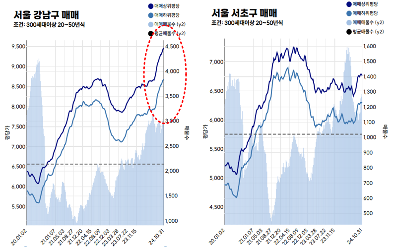 출처 : 손품왕 데이터 (강남, 서초 구축 호가 흐름)