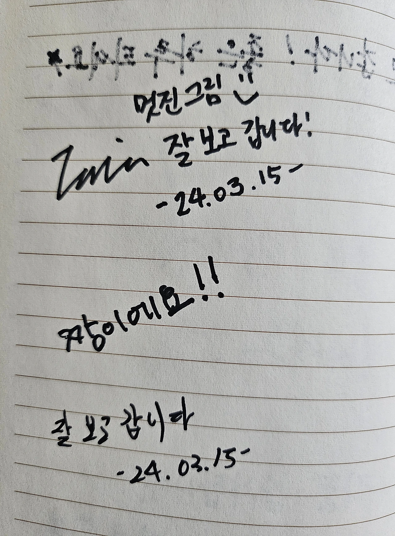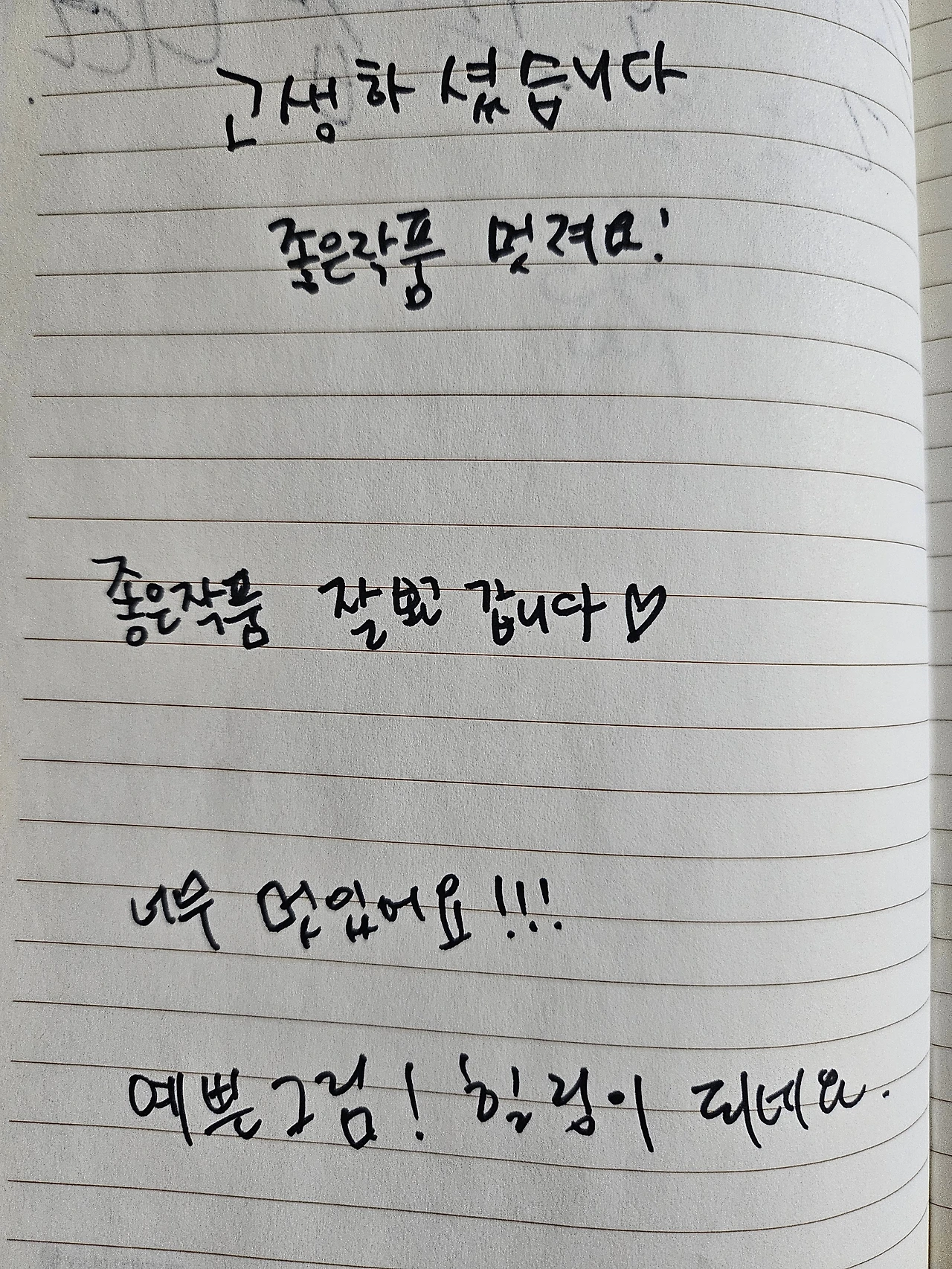6일 동안 진행되는 전시기간엔 학원수업도 함께 겹쳐있어서 주말로 들어가는 3일 정도만 갤러리에 나와볼 수 있었는데 그 사이 다녀가신 많은 관람객들이 방명록에 응원의 메시지들을 남겨주셨다.