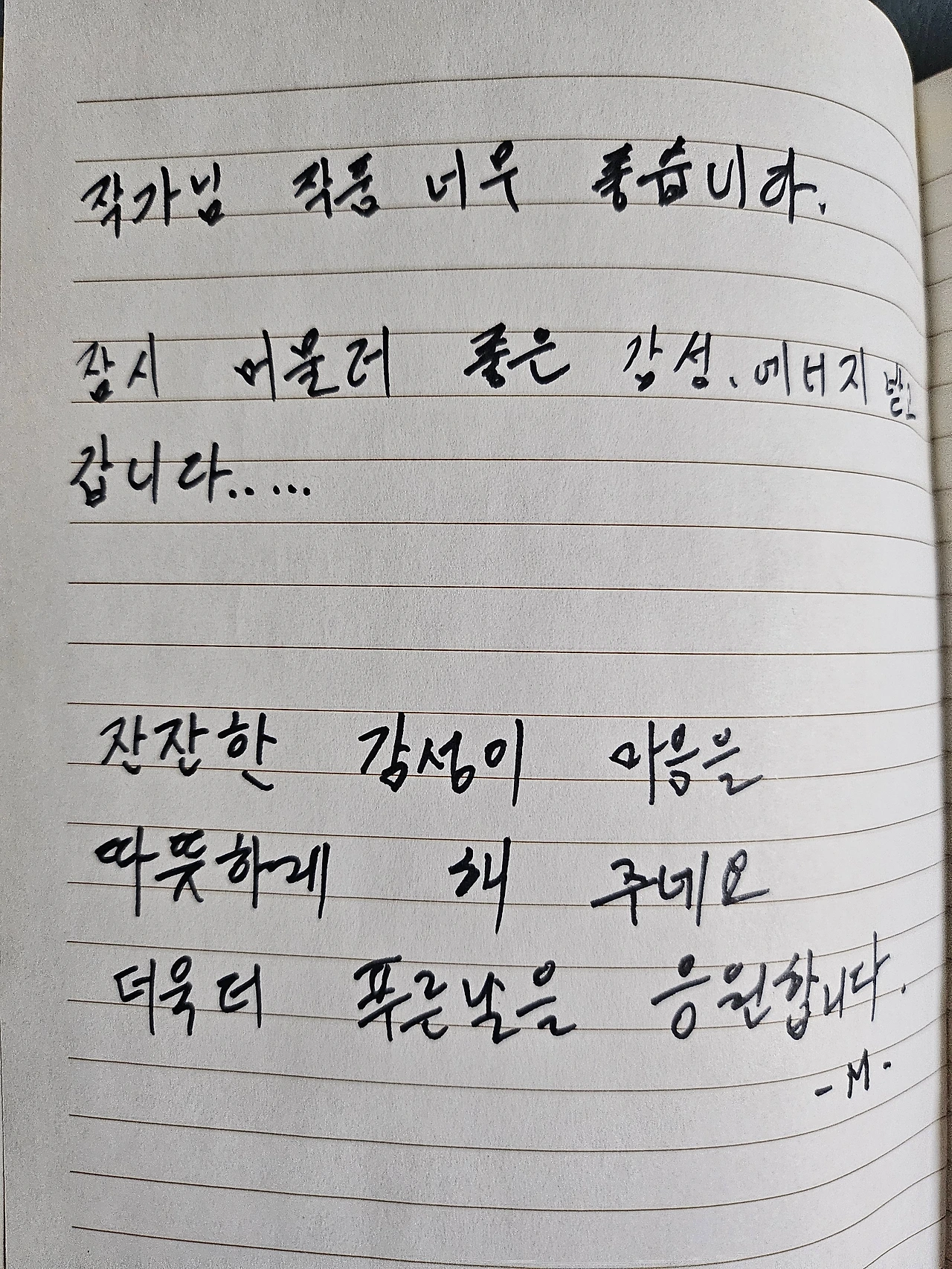 나라는 인간이 아닌 순수하게 나의 그림만을 보시고 격려해 주시고 따뜻하게 건네는 말 한마디 한마디가 그림 그리기를 잘했다는 벅찬 감동을 느끼게 한다.