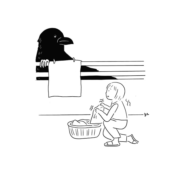 일본의 까마귀는 참새의 8배 정도, 비둘기의 3배 정도로 크다. 지붕 위에서 익룡 같은 소리를 내며 앉아있는 까마귀를 보면 금방이라도 나를 덮칠 것 같아 두려워진다. 일본에서 까마귀를 보는 것은 길조라 했는데, 길을 가다가도, 아침 빨래를 널다가도 까마귀를 보는 나는 매일이 두려운 행운의 날이다.