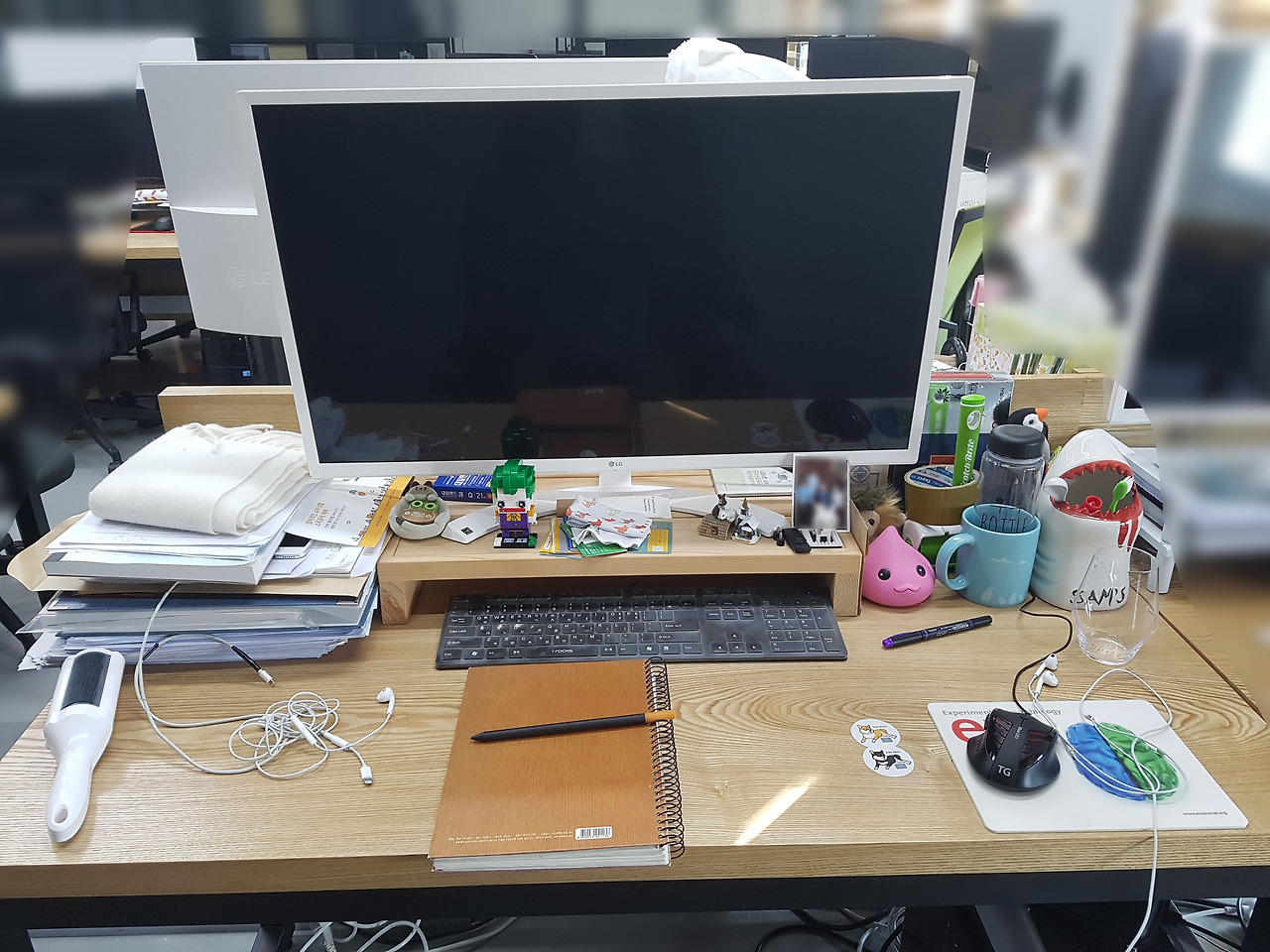 이번에는 이 사진을 통해, 위의 정보 외에 어떤 것을 더 알아낼 수 있을까? 책상에 붙어있는 시바견 스티커는 개에 대한 관심을 암시한다. 그리고 책상 왼쪽에 있는 반려동물 털 제거기(지마켓에서 이 이름의 물품을 찾을 수 있다)와 오른쪽 분홍색 슬라임 인형 뒤로 보이는 테이프와 먼지 제거 롤러는, 그 관심이 직접 키우는 것으로 이어졌음을 말해준다. (그런데 실제로는 고양이를 키우고 있다고 한다.)