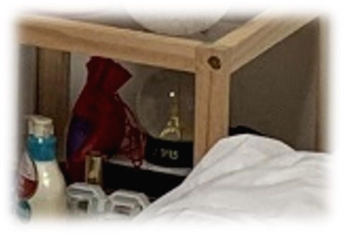 침대 왼쪽에 있는 작은 수납 선반 아래층에 놓인 'PARIS'라 써져있는 스노글로브는 주인이 프랑스 파리에 다녀왔음을 암시하며, 파리에서 간직하고 싶은 추억을 만들었다는 것을 암시한다. 물론, 그저 선물을 받은 물건일 수도 있고, 얼떨결에 산 의미 없는 기념품일 수도 있다. 하지만, 미니멀리즘이 느껴지는 이 방의 주인이 의미가 없는 물건들을 굳이 여기까지 가지고 왔을 것이라 보기 힘들다.