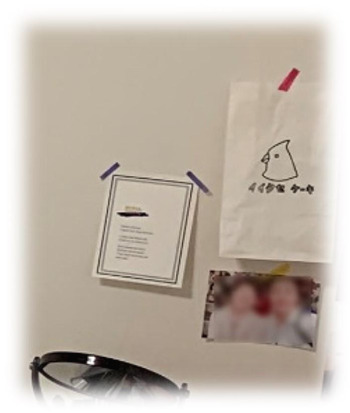 또한 오른쪽 벽에 붙어있는 독수리 모양 그림과 일본어가 써져있는 종이는, 검색을 통해 제주도에 있는 '이익새 양과점' 상표라는 것을 알 수 있다. 이를 통해 제주도에서 좋은 기억을 만들었거나, 적어도 이 양과점에서 먹은 음식이 좋은 기억이었음을 암시한다. 그리고, 그것을 본인이 잘 볼 수 있게 본인의 사진과 함께 붙여놓은 것을 보면, 그 종이가 여행에서의 좋은 기억을 불러일으키거나 여행하는 사람으로서의 정체성을 상기시켜주는 물건이라 생각할 수 있다. 이를 종합해 볼 때, 여행을 통해 좋은 추억을 만들었으며, 자연스럽게 여행을 좋아하는 (혹은 좋아하게 된) 사람이라 생각할 수 있다.