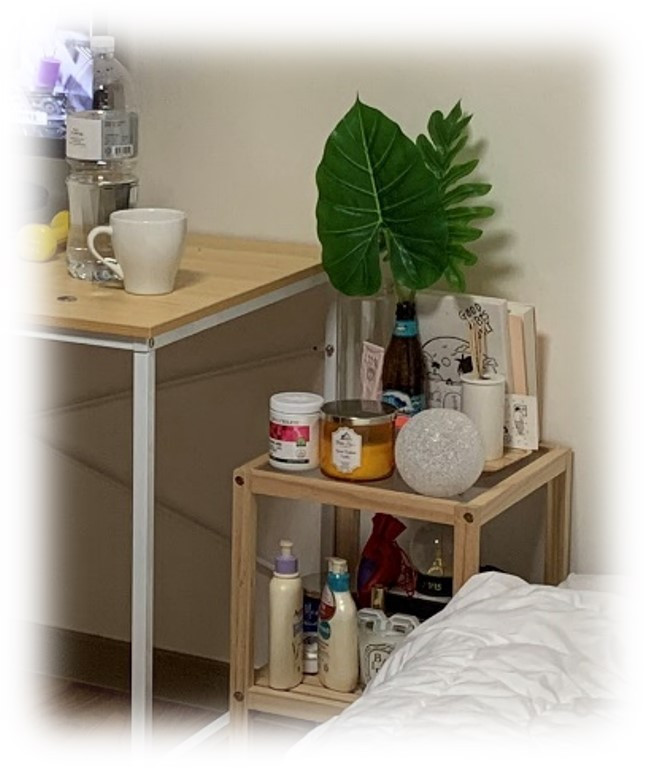 한 걸음 더 나아가 보자. 이 사진을 통해서 주인에 대해 어떤 것들을 더 알 수 있을까? 책상을 더 자세히 들여다보자. 책상에 눈에 띄는 대용량 생수가 있다. 수시로 물을 마시는 것 같다. 그리고 침대 왼쪽 아래칸에 있는 두 통의 로션이 있는데, 그중 하나는 심지어 포장지도 뜯지 않은 상태이다 (예비로 사두었을 가능성이 크다). 따라서 방 주인은 피부나 기관지에서 느껴지는 건조함을 신경 쓰고 있다는 것을 알 수 있다.