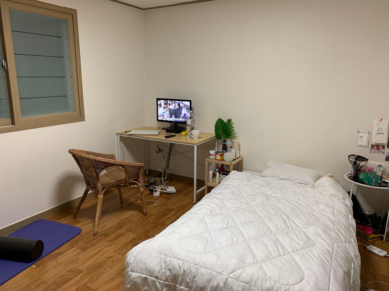 그리고 왼쪽 바닥에 보이는 요가매트와 책상에 놓인 아령은 운동에 대한 관심을 나타낸다. 그런데 여기서 또 하나의 가능성이 존재한다. 일시적인 충동에 운동 용품을 사놓고 가만히 썩히는 사람들이 많기에, 이 방의 주인도 그런 사람들 중 하나일 수 있다. 하지만, 요가매트는 바로 그 위에서 운동할 수 있게 관리되어 있고 아령 또한 손 닿기에 매우 좋은 위치에 있다. 그리고 전체적인 방 물품으로 볼 때 쓸모없는 물건은 최소화하려는 주인의 성향이 보인다. 이러한 성향이라면 쓸모없는 물건을 사거나, 계속 가지고 있을 가능성은 적다. 따라서, 방 주인은 운동에 관심이 있는 것을 알 수 있다.