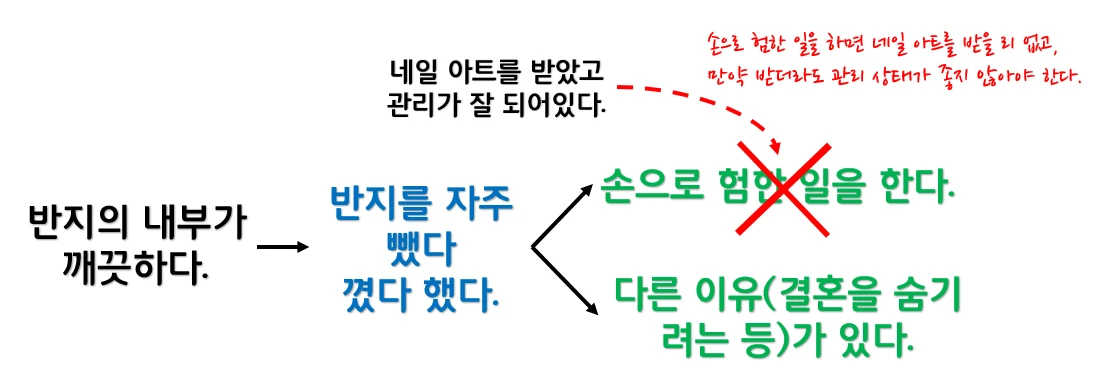 왜, 반지를 뺐다 끼는 걸 반복했을까? 손이 험하게 사용하는 직업이라 반지를 자주 빼놓는 것일 수도 있다. 하지만, 네일아트가 깨끗하게 유지된 손을 보아서는 손을 험하게 사용하는 직업일 가능성은 적다. 그렇다면, 남은 가능성은 무엇일까? 결혼반지를 빼고 결혼하지 않은 척 행세하는 것이다. 따라서 반지 주인은 몰래 다른 남자를 만나러 다니며 불륜을 저질렀다는 걸 알 수 있다.