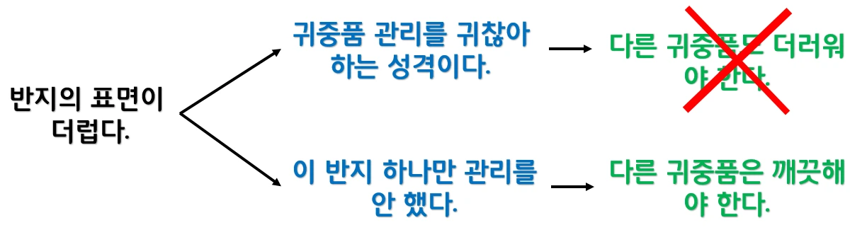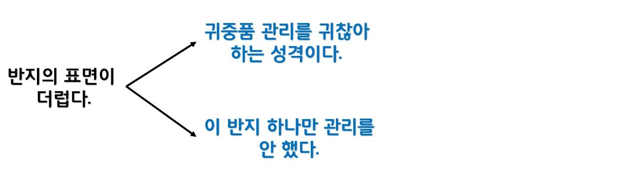어느 것이 정답일까? 생각해보자. 만약, 반지 주인이 귀중품 관리에 신경 쓰지 않는 타입이라면, 다른 귀중품들 또한 더러운 상태일 것이다. 그러나, 당시 반지 주인이 착용하고 있던 귀걸이, 목걸이 등의 장신구들은 깨끗하게 유지되고 있었다. 따라서, 귀중품을 관리하지 않는 타입은 아니다.