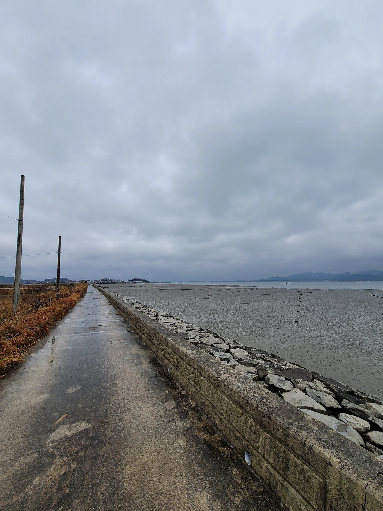 둑 위로 올라섰습니다. 둑은 쭈욱 이어졌는데 저 끝에는 마을이 있었습니다. 계속 차를 타고 이동했으니 걸어볼까 하고 별생각 없이 몇 걸음 내딛다가 갑자기 채석강 생각이 들었습니다. 채석강은 물 때가 있어서 제한적으로 볼 수 있다는 곳인데란 생각이 들고 물이 빠진 갯벌을 보자 고민하게 되었습니다.