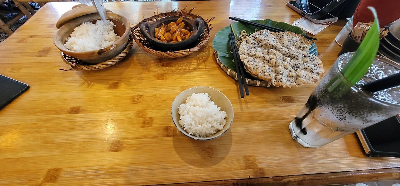 이 과정에서 이름에 대한 의미를 생각해 보았습니다. 쌀밥인데 밥의 특징이 다른 알알이 흐트러지는 것을 알 수 있었습니다. 새우도 먹어보면 한국과 차이가 없음을 알 수 있었습니다. 그런데 뻥튀기나 작은 조개와 함께 볶아져 나온 것들은 무엇인지 알 수 없었습니다. 마지막에 궁금에서 음료가 무엇인지 물어보고 알로에 주스인 것을 알 수 있었습니다.