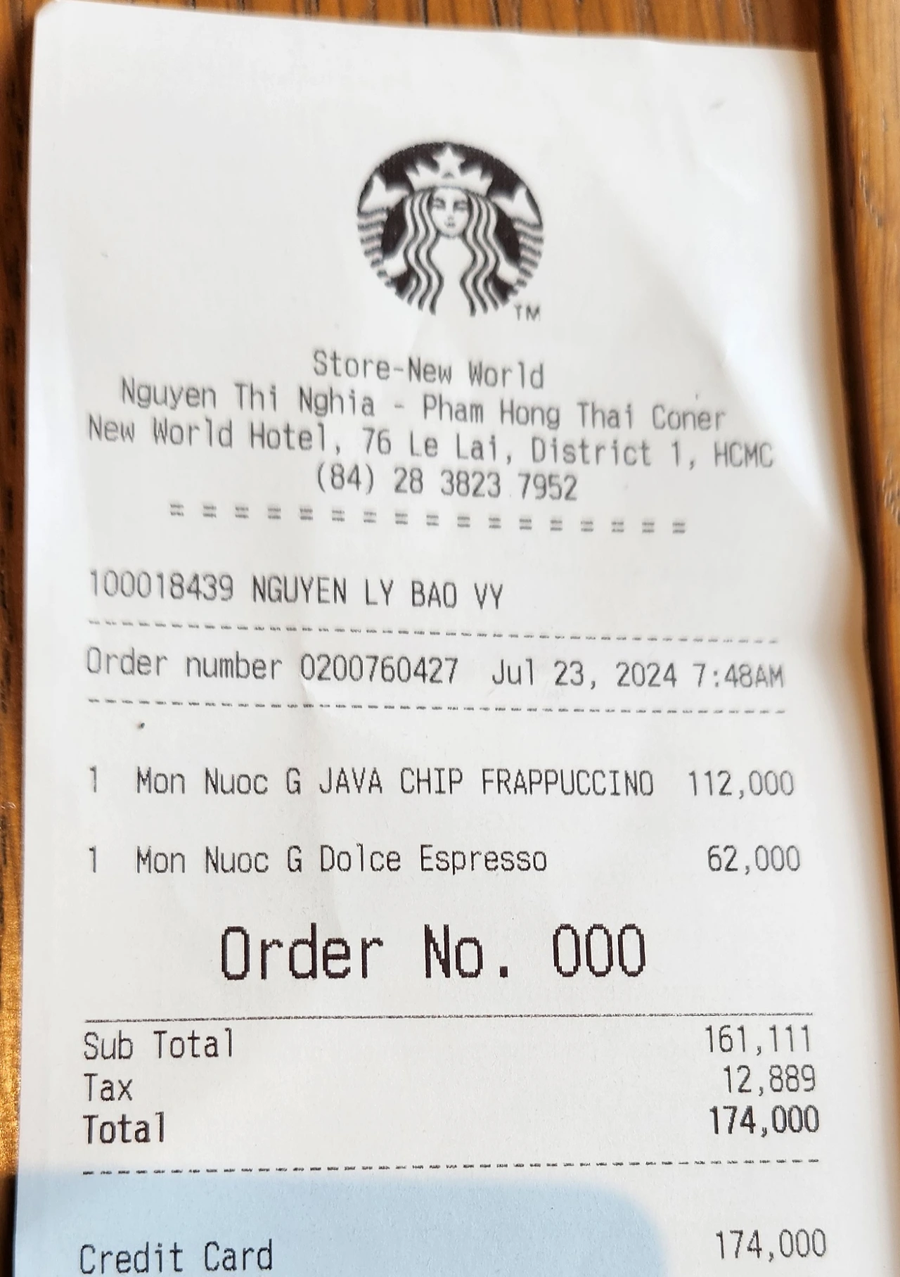 한국과 비교하면 자바칩 프라푸치노는 112000 동으로 7월 환율 기준 6200원 정도입니다. 돌체 라떼의 경우 62000동으로 약 3300원, 한국보다 저렴했습니다. 관광지에서 보는 카페 쓰어다라고 해서 연유를 넣은 커피가 약 4만 동으로 2000원 정도인 것과 비교하면 전체적으로 베트남에서 자주보이는 가격들과 비교할 때 높은 것으로 추정됩니다.