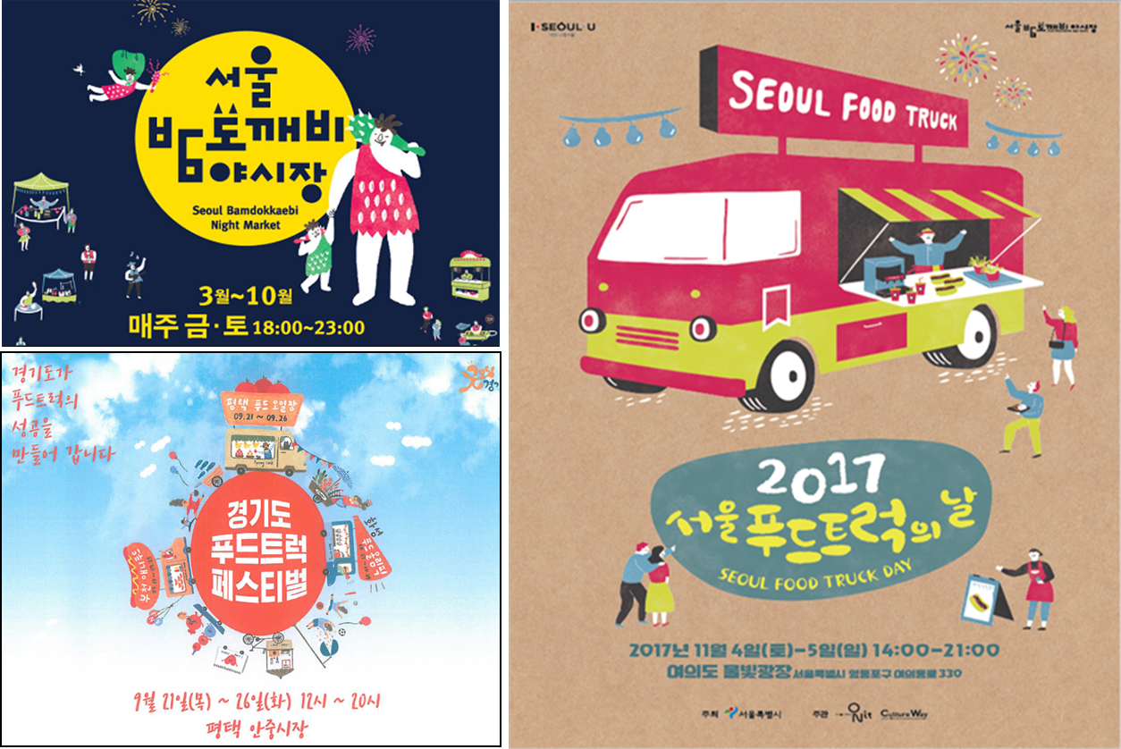 부천 국제 만화 축제장에서는 ‘애니 푸드(애니메이션+푸드트럭)’를 주제로, 평택 안중시장에서는 ‘푸드 5일장’을, 화성 행사장에서도 ‘푸드 올림픽’을 주제로 난타 퍼레이드 공연 등의 이벤트가 곁들여져 즐거운 축제 분위기를 만들었다.