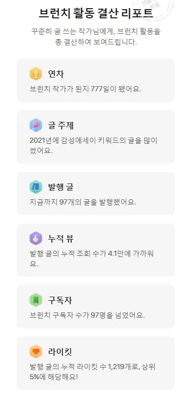 2021년을 마무리하면서 감사 인사를 하고 싶었는데 인사가 너무 늦었습니다. 이 글을 통해 감사한 마음을 전해 질까 모르겠지만, 그럼에도 늘 감사한 마음을 가지며 글을 쓰고 있어요. 부족한 제 글을 읽어주셔서 감사합니다, 라이킷을 눌러주시는 그 마음에도 늘 감동하고 있답니다. 함께 주셔서 감사합니다, 그리고 우리 함께 쓰는 글쓰기 친구가 되었으면 좋겠습니다 :) ♥